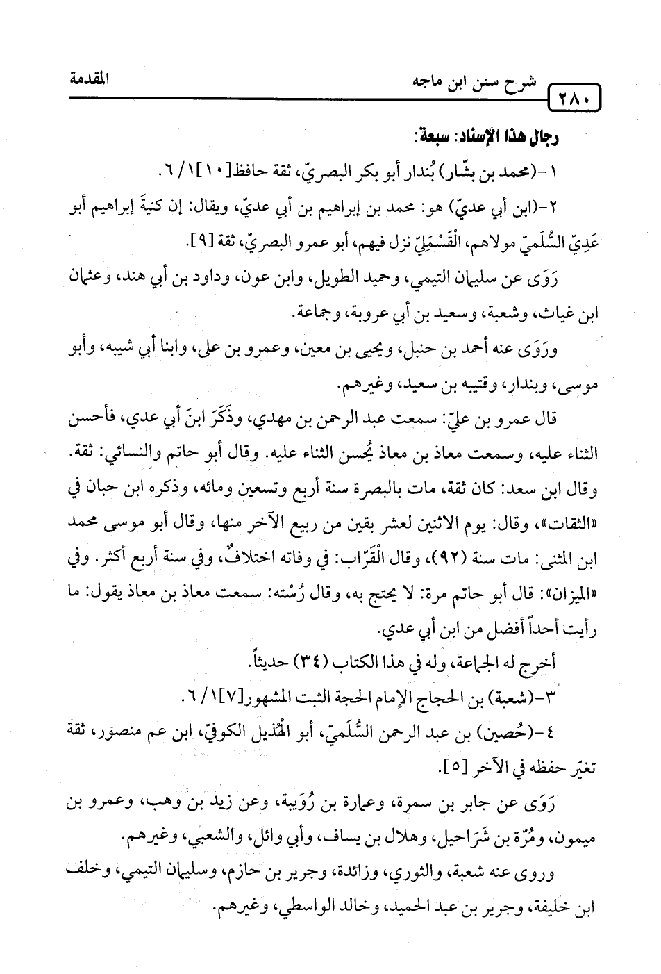 2 - (ابن أبي عديّ) هو: محمّد بن إبراهيم بن أبي عديّ، ويقال: إن كنيةَ إبراهيم أبو عَدِيّ السُّلَميّ مولاهم، الْقَسْمَلِيّ نزل فيهم، أبو عمرو البصريّ، ثقة [9].