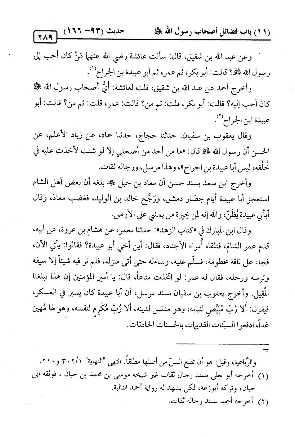وأخرج أحمد عن عبد الله بن شقيق، قلت لعائشة: أَيُّ أصحاب رسول الله -صلى الله عليه وسلم- كان أحب إليه؟ قالت: أبو بكر، قلت: ثمّ من؟ قالت: عمر، قلت: ثمّ من؟ قالت: أبو عبيدة ابن الجراح (¬2).