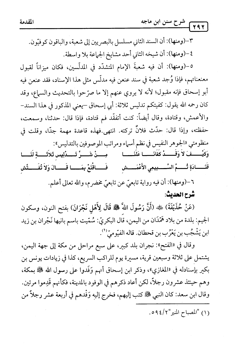 5 - (ومنها): أن فيه شعبةَ الإمام المتشدّد في المدلّسين، فكان ميزانًا لقبول معنعناتهم، فإذا وُجد شعبة في سند عنعن فيه مدلّس مثل هذا الإسناد، فقد عنعن فيه أبو إسحاق فإنّه مقبول؛ لأنه لا يروي عنهم إِلَّا ما صرّحوا بالتحديث والسماع، وقد كان رحمه الله يقول: كفيتكم تدليس ثلاثة: أبي إسحاق -يعني المذكور في هذا السند- والأعمش، وقتادة، وقال أيضًا: كنت أتفقّد فم قتادة، فإذا قال: حَدَّثَنَا، وسمعت، حفظته، وإذا قال: حدّث فلانٌ تركته. انتهى. فهذه قاعدة مهمة جدًّا، وقلت في منظومتي "الجوهر النَّفْيس في نظم أسماء ومراتب الموصوفين بالتدليس":