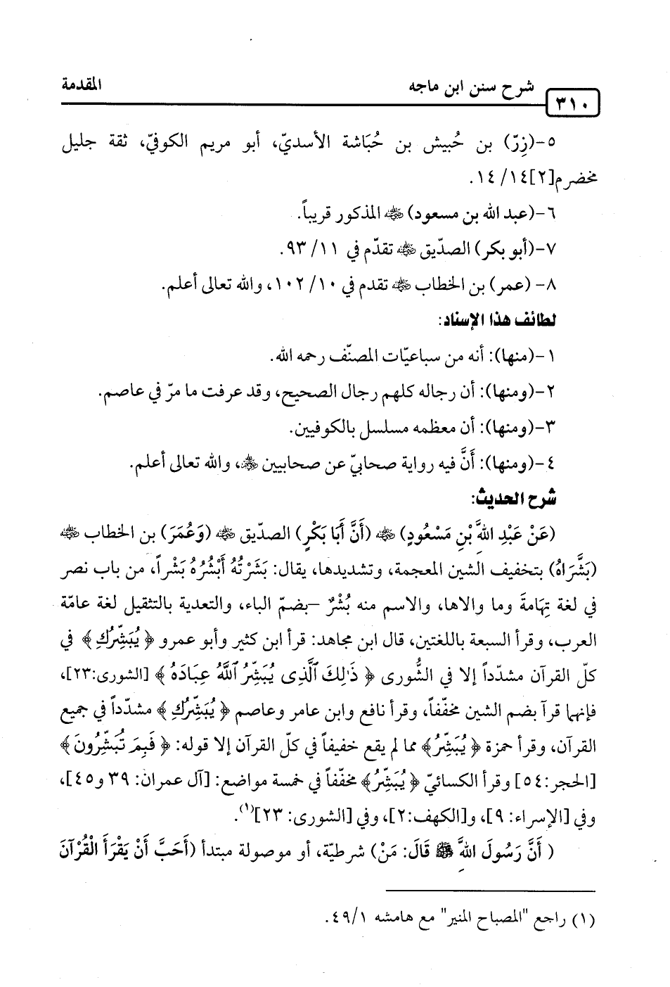 (عَنْ عَبْدِ الله بْنِ مَسْعُود) -رضي الله عنه- (أَنَّ أَبَا بَكْرِ) الصدّيق -رضي الله عنه- (وَعُمَرَ) بن الخطّاب -رضي الله عنه- (بَشَّرَاهُ) بتخفيف الشين المعجمة، وتشديدها، يقال: بَشَرْتُهُ أَبْشُرُهُ بَشرًا، من باب نصر في لغة تِهَامةَ وما والاها، والاسم منه بُشْرٌ -بضمّ الباء، والتعدية بالتثقيل لغة عامّة العرب، وقرأ السبعة باللغتين، قال ابن مجاهد: قرأ ابن كثير وأبو عمرو {يُبَشِّرُكِ} في كلّ القرآن مشدّدًا إِلَّا في الشُّورى، {ذَلِكَ الَّذِي يُبَشِّرُ اللَّهُ عِبَادَهُ} [الشورى: 23] فإنهما قرآ بضم الشين مخفّفًا، وقرأ نافع وابن عامر وعاصم {يُبَشِّركِ} مشدّدًا في جميع القرآن، وقرأ حمزة {يُبَشِرُ} ممّا لم يقع خفيفًا في كلّ القرآن إِلَّا قوله: {فَبِمَ تبشِّرُونَ} [الحجر: 54] وقرأ الكسائيّ {يُبَشِّرُ} مخفّفًا في خمسة مواضع: [آل عمران: 39 و 45]، وفي [الإسراء: 9]، و [الكهف: 2]، وفي [الشورى: 23] (¬1).