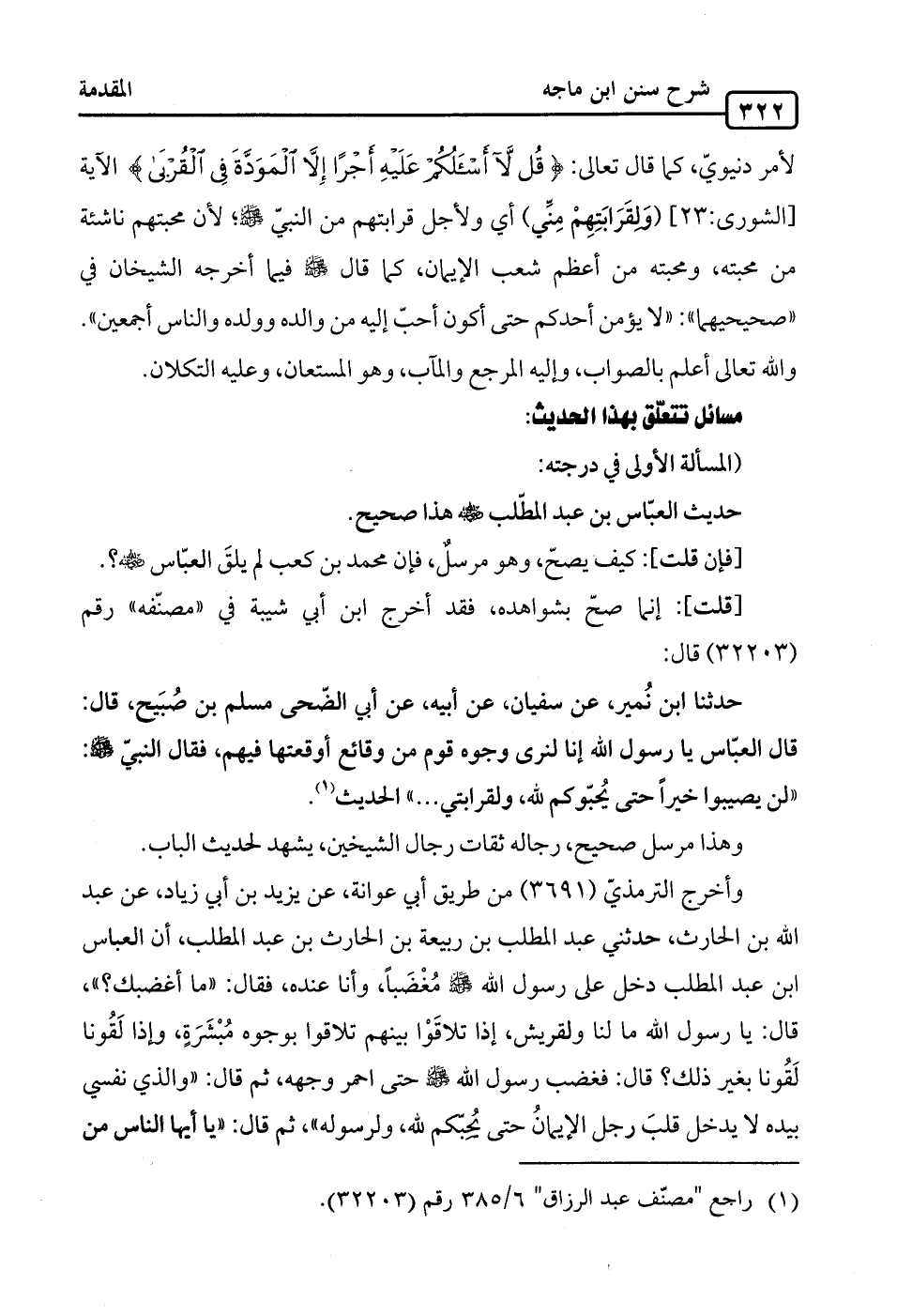وأخرج الترمذيّ (3691) من طريق أبي عوانة، عن يزيد بن أبي زياد، عن عبد الله بن الحارث، حدثني عبد المطلب بن ربيعة بن الحارث بن عبد المطلب، أن العباس ابن عبد المطلب دخل على رسول الله -صلى الله عليه وسلم- مُغْضَبًا، وأنا عنده، فقال: "ما أغضبك؟ "، قال: يا رسول الله ما لنا ولقريش، إذا تلاقَوْا بينهم تلاقوا بوجوه مُبْشَرَةٍ، وإذا لَقُونا لَقُونا بغير ذلك؟ قال: فغضب رسول الله -صلى الله عليه وسلم- حتّى احمر وجهه، ثمّ قال: "والذي نفسي بيده لا يدخل قلبَ رجلٍ الإيمانُ حتّى يُحِبَّكم لله، ولرسوله"، ثمّ قال: "يا أيها النَّاس من