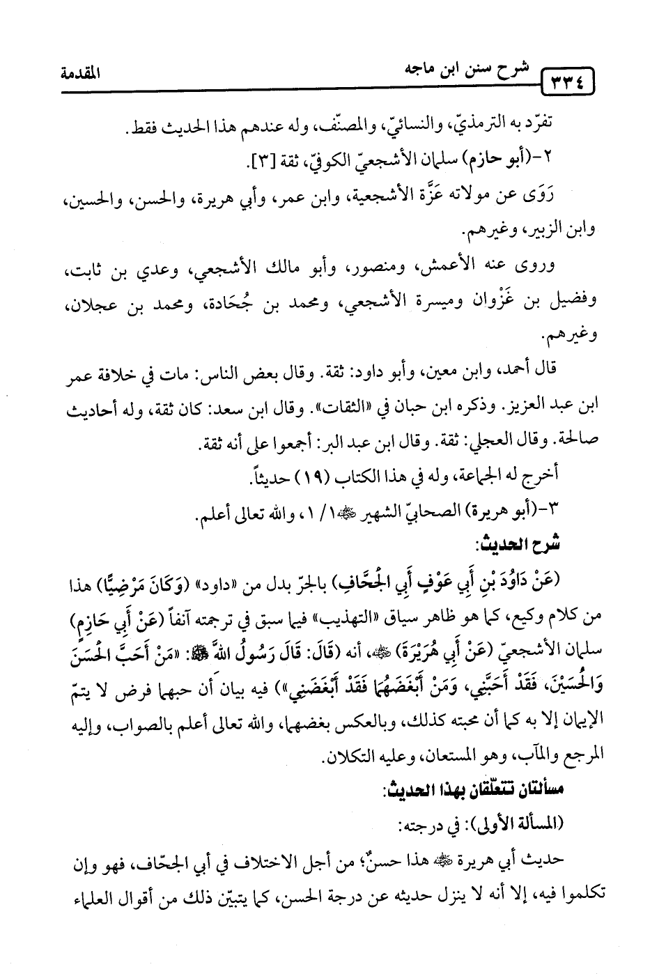 (عَنْ دَاوُدَ بْنِ أَبِي عَوْفٍ أَبِي الجُحَّافِ) بالجرّ بدل من "داود" (وَكَانَ مَرْضِيًّا) هذا من كلام وكيع، كما هو ظاهر سياق "التهذيب" فيما سبق في ترجمته آنفًا (عَنْ أَبِي حَازِمٍ) سلمان الأشجعيّ (عَنْ أَبِي هُرَيْرَةَ) -رضي الله عنه-، أنه (قَالَ: قَالَ رَسُولُ الله -صلى الله عليه وسلم-: "مَنْ أَحَبَّ الحسَنَ وَالحُسَيْنَ، فَقَدْ أَحَبَّنِي، وَمَنْ أَبْغَضَهُمَا فَقَدْ أَبْغَضَنِي") فيه بيانَ أن حبهما فرض لا يتمّ الإيمان إِلَّا به كما أن محبته كذلك، وبالعكس بغضهما، والله تعالى أعلم بالصواب، وإليه المرجع والمآب، وهو المستعان، وعليه التكلان.