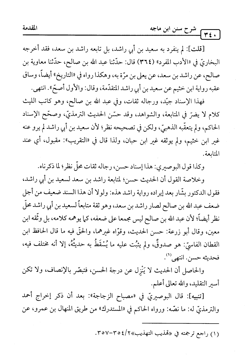 فهذا الإسناد جيّد، ورجاله ثقات، وفي عبد الله بن صالح، وهو كاتب الليث كلام لا يضرّ في المتابعة، والشواهد، وقد حسّن الحديث الترمذيّ، وصحّح الإسناد الحاكم، ولم يتعقّبه الذهبيّ، ولكن في تصحيحه نظر؛ لأن سعيد بن أبي راشد لم يرو عنه غير ابن خثيم، ولم يوثقه غير ابن حبّان، ولذا قال في "التقريب": مقبول، أي عند المتابعة.
