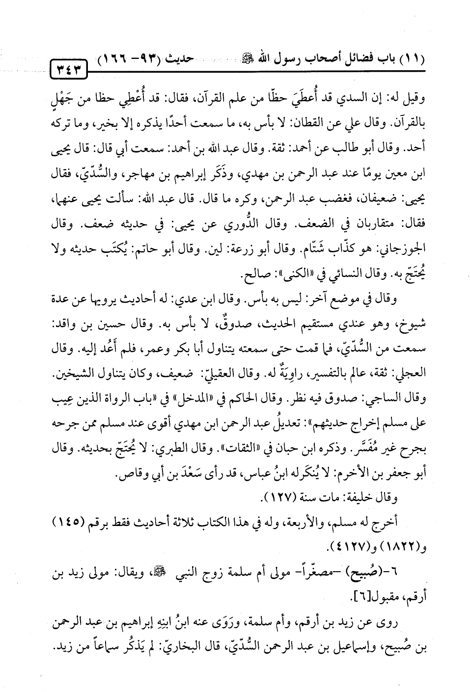 وقال في موضع آخر: ليس به بأس. وقال ابن عدي: له أحاديث يرويها عن عدة شيوخ، وهو عندي مستقيم الحديث، صدوقٌ، لا بأس به. وقال حسين بن واقد: سمعت من السُّدّيّ، فما قمت حتّى سمعته يتناول أبا بكر وعمر، فلم أَعُد إليه. وقال العجلي: ثقة، عالم بالتفسير، راوِيَةٌ له. وقال العقيليّ: ضعيف، وكان يتناول الشيخين. وقال الساجي: صدوق فيه نظر. وقال الحاكم في "المدخل" في "باب الرواة الذين عِيب على مسلم إخراج حديثهم": تعديلُ عبد الرّحمن ابن مهدي أقوى عند مسلم ممّن جرحه بجرح غير مُفَسَّر. وذكره ابن حبّان في "الثِّقات". وقال الطّبريّ: لا يُحتَجّ بحديثه. وقال أبو جعفر بن الأخرم: لا يُنكَر له ابنُ عبّاس، قد رأى سَعْدَ بن أبي وقّاص.