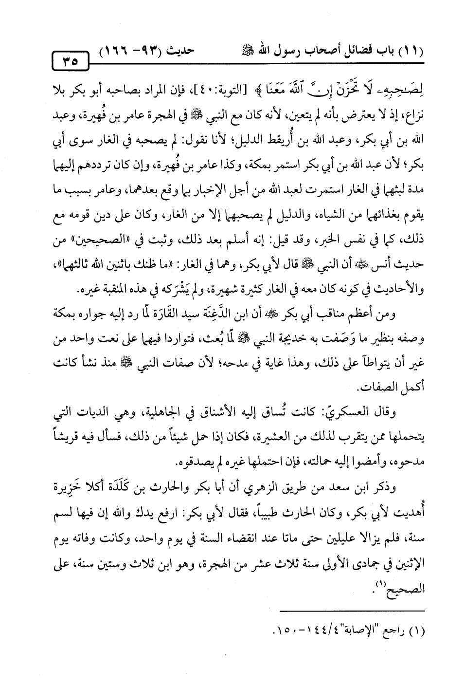 لِصَاحِبِهِ لَا تَحْزَنْ إِنَّ اللَّهَ مَعَنَا} [التوبة: 40]، فإن المراد بصاحبه أبو بكر بلا نزاع، إذ لا يعترض بأنه لم يتعين، لأنه كان مع النبي -صلى الله عليه وسلم- في الهجرة عامر بن فُهيرة، وعبد الله بن أبي بكر، وعبد الله بن أُريقط الدليل؛ لأنا نقول: لم يصحبه في الغار سوى أبي بكر؛ لأن عبد الله بن أبي بكر استمر بمكة، وكذا عامر بن فُهيرة، وإن كان ترددهم إليهما مدة لبثهما في الغار استمرت لعبد الله من أجل الإخبار بما وقع بعدهما، وعامر بسبب ما يقوم بغذائهما من الشياه، والدليل لم يصحبهما إلا من الغار، وكان على دين قومه مع ذلك، كما في نفس الخبر، وقد قيل: إنه أسلم بعد ذلك، وثبت في "الصحيحين" من حديث أنس -رضي الله عنه- أن النبي -صلى الله عليه وسلم- قال لأبي بكر، وهما في الغار: "ما ظنك باثنين الله ثالثهما"، والأحاديث في كونه كان معه في الغار كثيرة شهيرة، ولم يَشْرَكه في هذه المنقبة غيره.