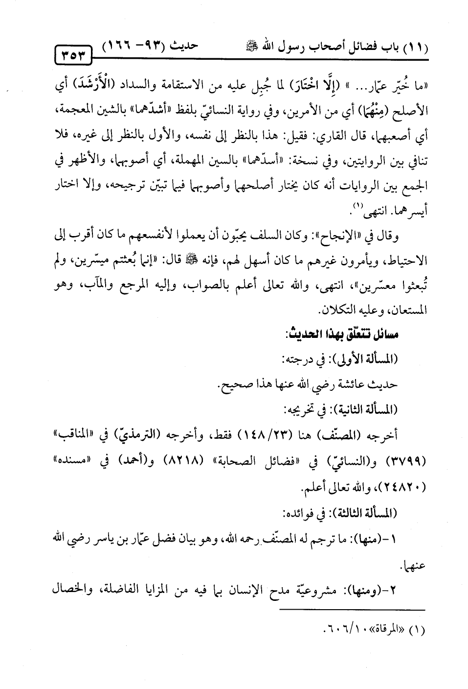 "ما خُيّر عمّار ... " (إِلَّا اخْتَارَ) لما جُبِل عليه من الاستقامة والسداد (الْأَرْشَدَ) أي الأصلح (مِنْهُما) أي من الأمرين، وفي رواية النَّسائيّ بلفظ "أشدّهما" بالشين المعجمة، أي أصعبهما، قال القاري: فقيل: هذا بالنظر إلى نفسه، والأول بالنظر إلى غيره، فلا تنافي بين الروايتين، وفي نسخة: "أسدّهما" بالسين المهملة، أي أصوبهما، والأظهر في الجمع بين الروايات أنه كان يختار أصلحهما وأصوبهما فيما تبيّن ترجيحه، وإلا اختار أيسرهما. انتهى (¬1).
