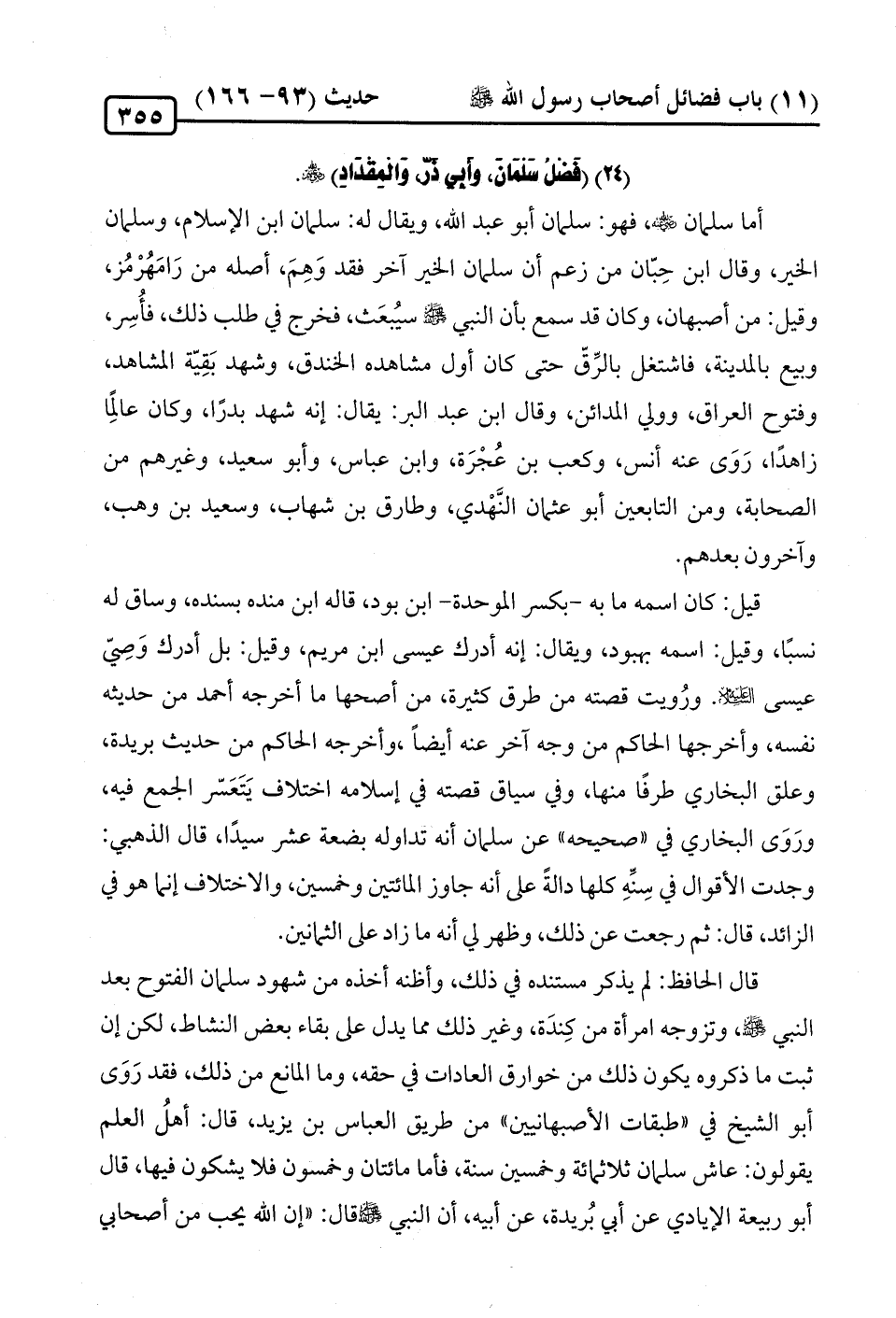 قال الحافظ: لم يذكر مستنده في ذلك، وأظنه أخذه من شهود سلمان الفتوح بعد النّبيّ -صلى الله عليه وسلم-، وتزوجه امرأة من كِندَة، وغير ذلك ممّا يدلُّ على بقاء بعض النشاط، لكن إن ثبت ما ذكروه يكون ذلك من خوارق العادات في حقه، وما المانع من ذلك، فقد رَوَى أبو الشّيخ في "طبقات الأصبهانيين" من طريق العباس بن يزيد، قال: أهلُ العلم يقولون: عاش سلمان ثلاثمائة وخمسين سنة، فأمّا مائتان وخمسون فلا يشكون فيها، قال أبو ربيعة الإيادي عن أبي بُريدة، عن أبيه، أن النّبيّ -صلى الله عليه وسلم- قال: "إن الله يحب من أصحابي