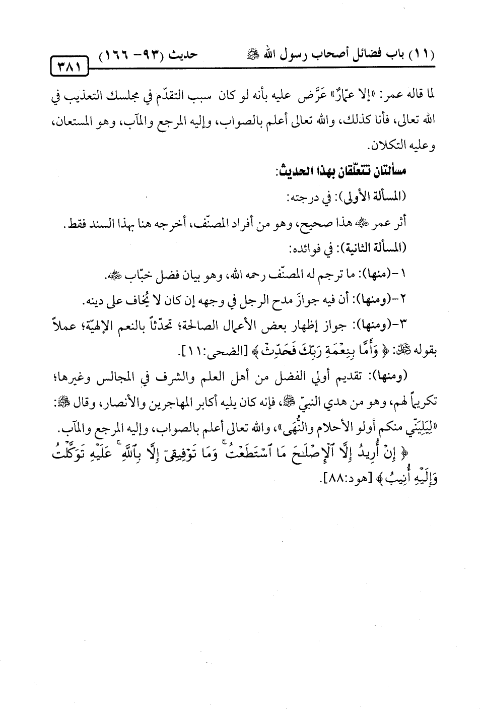 3 - (ومنها): جواز إظهار بعض الأعمال الصالحة؛ تحدّثًا بالنعم الإلهيّة؛ عملًا بقوله -رضي الله عنه-: {وَأَمَّا بِنِعْمَةِ رَبِّكَ فَحَدِّثْ} [الضحى: 11].