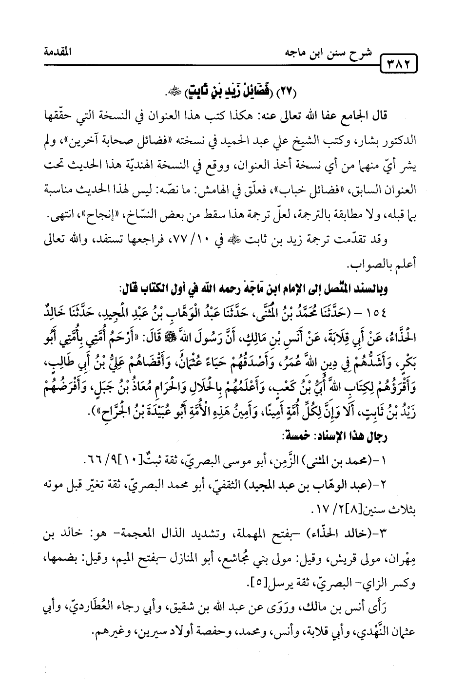 154 - (حَدَّثَنَا مُحَمَّدُ بْنُ المُثَنَّى، حَدَّثَنَا عَبْدُ الْوَهَابِ بْنُ عَبْدِ الْمَجِيدِ، حَدَّثَنَا خَالِدٌ الحَذَّاءُ، عَنْ أَبِي قِلَابَةَ، عَنْ أَنَسِ بْنِ مَالِكٍ، أَنَّ رَسُولَ الله -صلى الله عليه وسلم- قَالَ: "أَرْحَمُ أُمَّتِي بِأُمَّتِي أَبُو بَكْرٍ، وَأَشَدُّهُمْ في دِينِ الله عُمَرُ، وَأَصْدَقُهُمْ حَيَاءً عُثْمَانُ، وَأَقْضَاهُمْ عَليُّ بْنُ أَبِي طَالِبٍ، وَأَقْرَؤُهُمْ لِكِتَاب الله أُبَيُّ بْنُ كعْبٍ، وَأَعْلَمُهُمْ بِالْحَلَالِ وَالحَرَامِ مُعَاذُ بْنُ جَبَلٍ، وَأَفْرَضُهُمْ زَيْدُ بْنُ ثَابِتٍ، أَلَا وَإِنَّ لِكُلِّ أُمَّةٍ أَمِينًا، وَأَمِينُ هَذه الْأُمَّةِ أَبُو عُبَيْدَةَ بْنُ الجرَّاحِ").