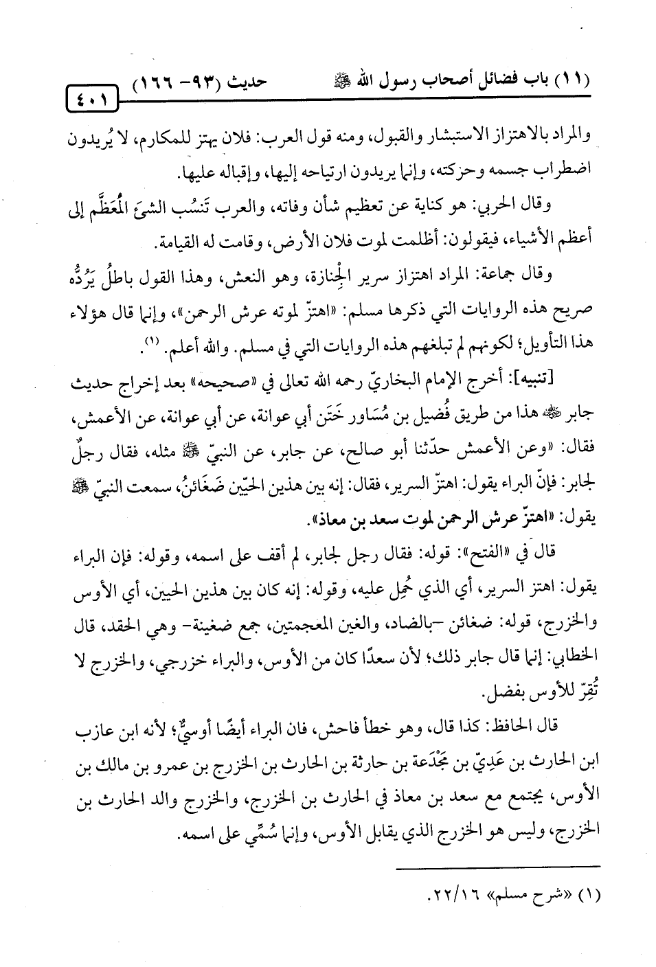 وقال جماعة: المراد اهتزاز سرير الجنازة، وهو النعش، وهذا القول باطلُ يَرُدُّه صريح هذه الروايات الّتي ذكرها مسلم: "اهتزّ لموته عرش الرّحمن"، وإنّما قال هؤلاء هذا التّأويل؛ لكونهم لم تبلغهم هذه الروايات الّتي في مسلم. والله أعلم. (¬1).