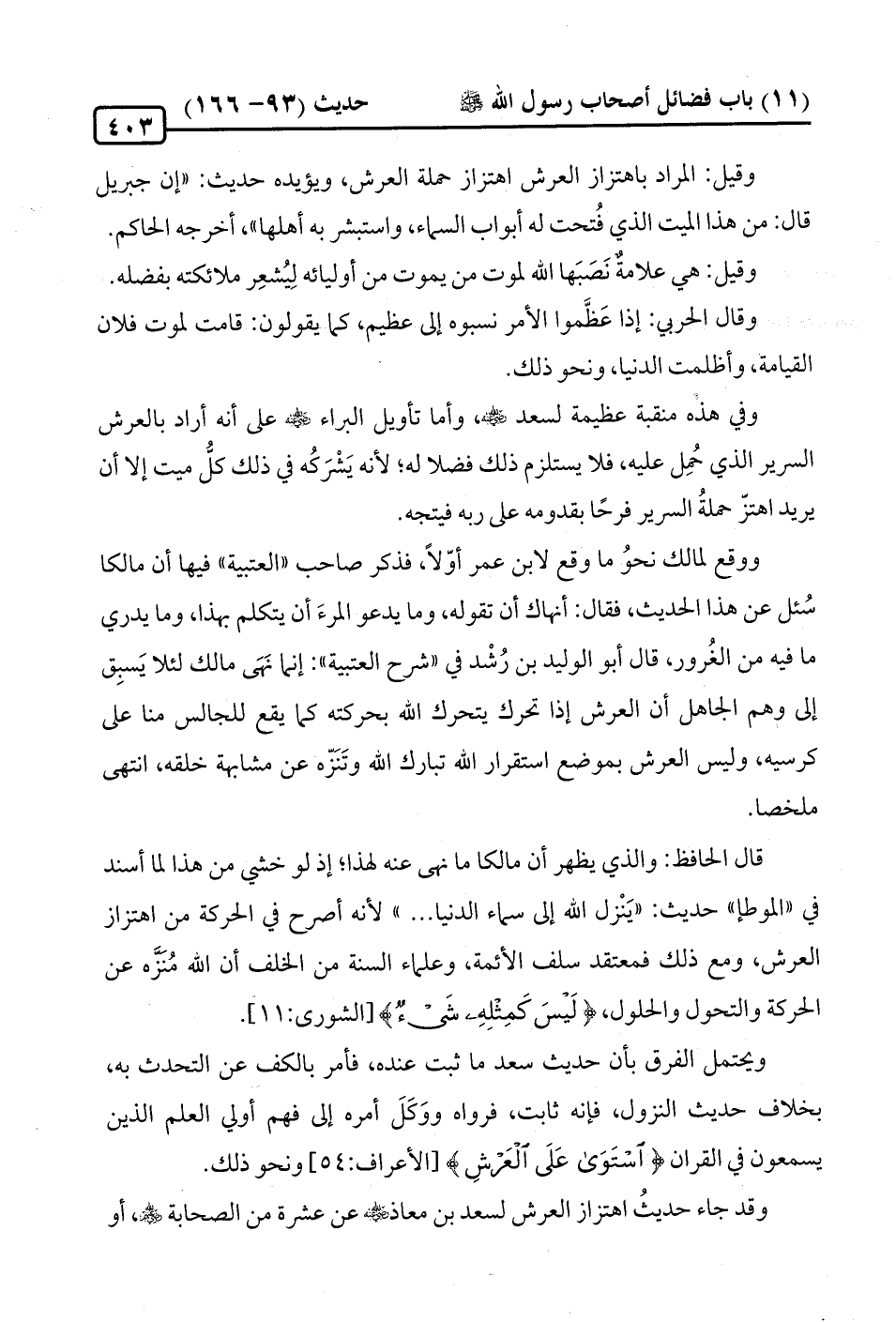 ووقع لمالك نحوُ ما وقع لابن عمر أوّلًا، فذكر صاحب "العتبية" فيها أن مالكا سُئل عن هذا الحديث، فقال: أنهاك أن تقوله، وما يدعو المرءَ أن يتكلم بهذا، وما يدري ما فيه من الغُرور، قال أبو الوليد بن رُشْد في "شرح العتبية": إنّما نَهَى مالك لئلا يَسبِق إلى وهم الجاهل أن العرش إذا تحرك يتحرك الله بحركته كما يقع للجالس منا على كرسيه، وليس العرش بموضع استقرار الله تبارك الله وتَنَزّه عن مشابهة خلقه، انتهى ملخصا.
