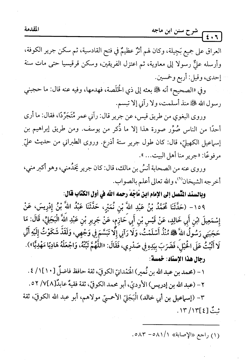 159 - (حَدَّثَنَا مُحَمَّدُ بْنُ عَبْدِ الله بْنِ نُمَيْرٍ، حَدَّثَنَا عَبْدُ الله بْنُ إِدْرِيسَ، عَنْ إِسْمَاعِيلَ ابْنِ أَبِي خَالِدٍ، عَنْ قَيْسِ بْنِ أَبِي حَازِم، عَنْ جَرِيرِ بْنِ عَبْدِ الله الْبَجَليِّ، قَالَ: مَا حَجَبَنِي رَسُولُ الله -صلى الله عليه وسلم- مُنْذُ أَسْلَمْتُ، وَلَا رَآنِي إِلا تَبَسَّمَ في وَجْهِي، وَلَقَدْ شَكَوْتُ إِلَيْهِ أَنِّي لَا أثبُتُ عَلَى الخَيْلِ، فَضَرَبَ بِيَدِهِ في صَدْرِي، فَقَالَ: "اللِّهُمَّ ثَبِّتْهُ، وَاجْعَلْهُ هَادِيّا مَهْدِيًّا").