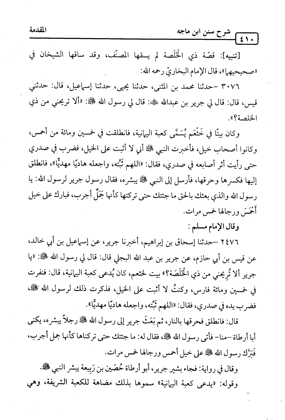 2476 - حَدَّثَنَا إسحاق بن إبراهيم، أَخْبَرَنَا جرير، عن إسماعيل بن أبي خالد، عن قيس بن أبي حازم، عن جرير بن عبد الله البجلي قال: قال لي رسول الله -صلى الله عليه وسلم-: "يا جرير ألَّا تُرِيحني من ذي الْخَلَصَة؟ " بيت لخثعم، كان يُدعى كعبة اليمانية، قال: فنفرت في خمسين ومائة فارس، وكنتُ لا أثبت على الخيل، فذكرت ذلك لرسول الله -صلى الله عليه وسلم-، فضرب يده في صدري، فقال: "اللَّهُمَّ ثَبِّته، واجعله هاديًا مهديًّا".