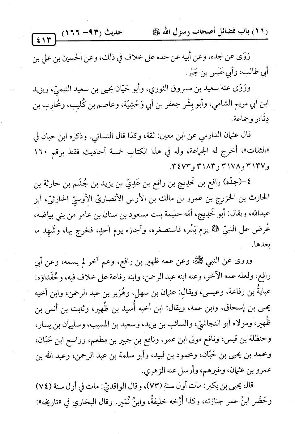 4 - (جدّه) رافع بن خَدِيج بن رافع بن عَدِيّ بن يزيد بن جُشَم بن حارثة بن الحارث بن الخزرج بن عمرو بن مالك بن الأوس الأنصاريّ الأوسيّ الحارثيّ، أبو عبد الله، ويقال: أبو خَدِيج، أمّه حليمة بنت مسعود بن سنان بن عامر من بني بياضة، عُرض على النبيّ -صلى الله عليه وسلم- يوم بَدْر، فاستصغره، وأجازه يوم أحد، فخرج بها، وشَهِد ما بعدها.