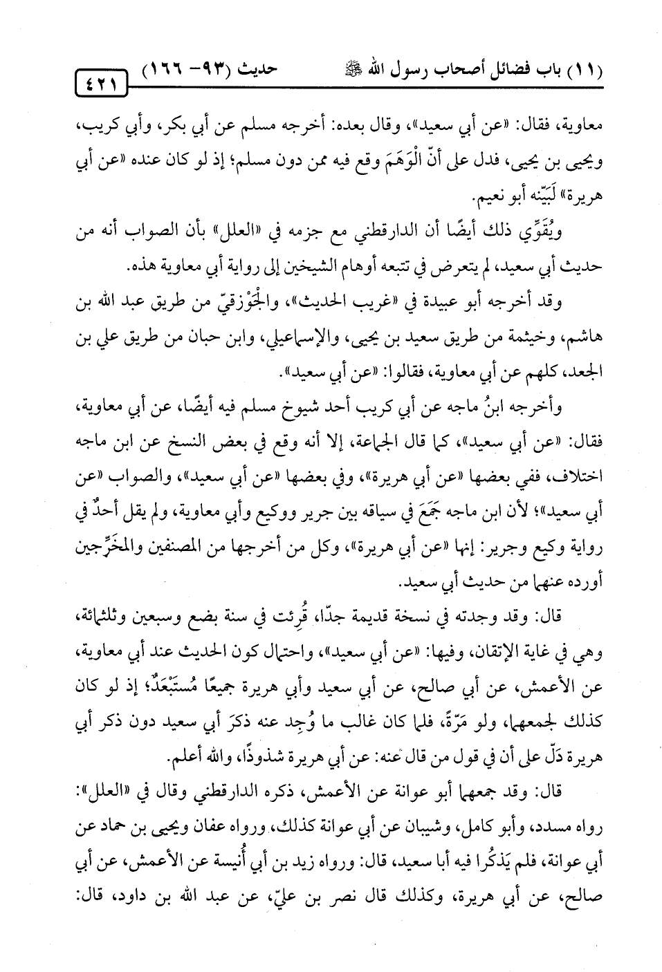 قال: وقد وجدته في نسخة قديمة جدًّا، قُرِئت في سنة بضع وسبعين وثلثمائة، وهي في غاية الإتقان، وفيها: "عن أبي سعيد"، واحتمال كون الحديث عند أبي معاوية، عن الأعمش، عن أبي صالح، عن أبي سعيد وأبي هريرة جميعًا مُستَبْعَدٌ؛ إذ لو كان كذلك لجمعهما، ولو مَرّةً، فلما كان غالب ما وُجِد عنه ذكرَ أبي سعيد دون ذكر أبي هريرة دَلّ على أن في قول من قال عنه عن أبي هريرة شذوذًا، والله أعلم.