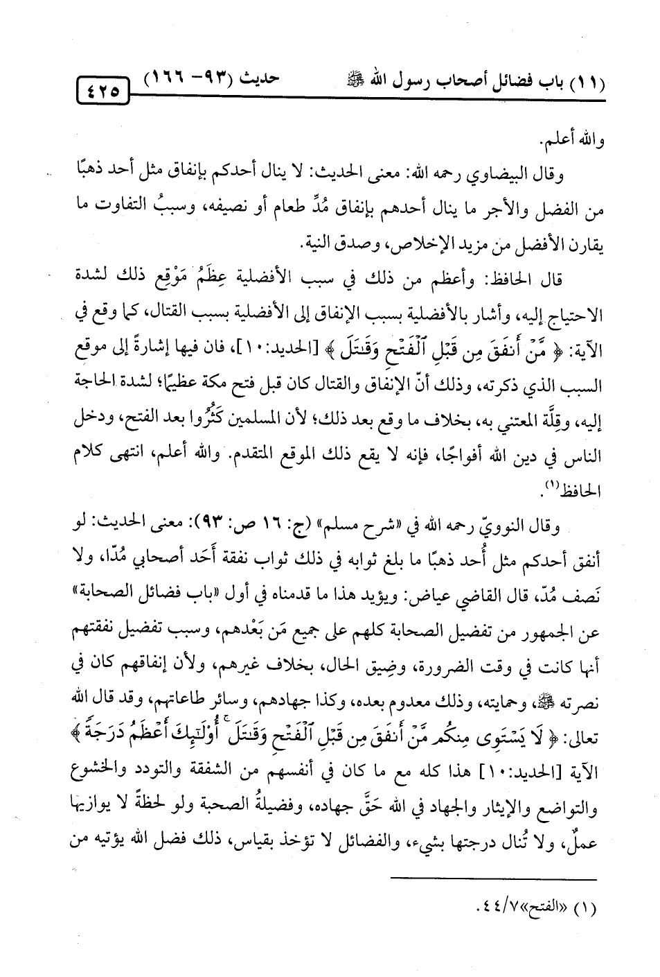 قال الحافظ: وأعظم من ذلك في سبب الأفضلية عِظَمُ مَوْقِع ذلك لشدة الاحتياج إليه، وأشار بالأفضلية بسبب الإنفاق إلى الأفضلية بسبب القتال، كما وقع في الآية: {مَنْ أَنْفَقَ مِنْ قَبْلِ الْفَتْحِ} [الحديد: 10]، فإن فيها إشارة إلى موقع السبب الّذي ذكرته، وذلك أن الإنفاق والقتال كان قبل فتح مكّة عظيمًا؛ لشدة الحاجة إليه، وقِلَّة المعتني به، بخلاف ما وقع بعد ذلك؛ لأن المسلمين كَثُرُوا بعد الفتح، ودخل النَّاس في دين الله أفواجًا، فإنّه لا يقع ذلك الموقع المتقدم. والله أعلم، انتهى كلام الحافظ (¬1).