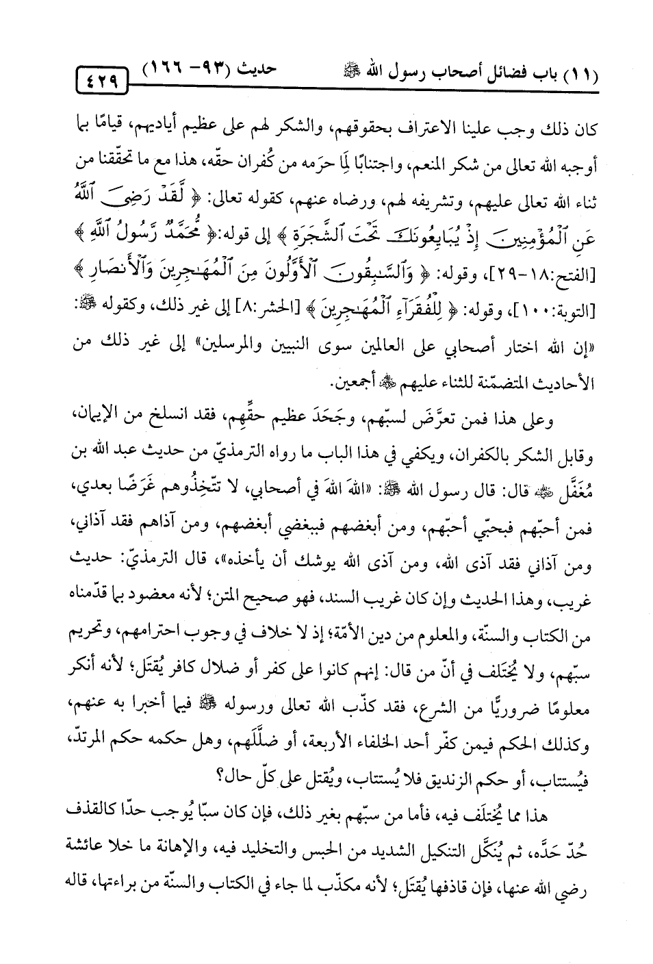 وعلى هذا فمن تعرَّضَ لسبّهم، وجَحَدَ عظيم حقِّهِم، فقد انسلخ من الإيمان، وقابل الشكر بالكفران، ويكفي في هذا الباب ما رواه الترمذيّ من حديث عبد الله بن مُغَفَّل -رضي الله عنه- قال: قال رسول الله -صلى الله عليه وسلم-: "اللهَ اللهَ في أصحابي، لا تتّخِذوهم غَرَضًا بعدي، فمن أحبّهم فبحبّي أحبّهم، ومن أبغضهم فببغضي أبغضهم، ومن آذاهم فقد آذاني، ومن آذاني فقد آذى الله، ومن آذى الله يوشك أن يأخذه"، قال الترمذيّ: حديث غريب، وهذا الحديث وإن كان غريب السند، فهو صحيح المتن؛ لأنه معضود بما قدّمناه من الكتاب والسنّة، والمعلوم من دين الأمّة؛ إذ لا خلاف في وجوب احترامهم، وتحريم سبّهم، ولا يُختَلف في أن من قال: إنهم كانوا على كفر أو ضلال كافر يُقتَل؛ لأنه أنكر معلومًا ضروريًّا من الشّرع، فقد كذّب الله تعالى ورسوله -صلى الله عليه وسلم- فيما أخبرا به عنهم، وكذلك الحكم فيمن كفّر أحد الخلفاء الأربعة، أو ضلَّلَهم، وهل حكمه حكم المرتدّ، فيُستتاب، أو حكم الزنديق فلا يُستتاب، ويُقتل على كلّ حال؟