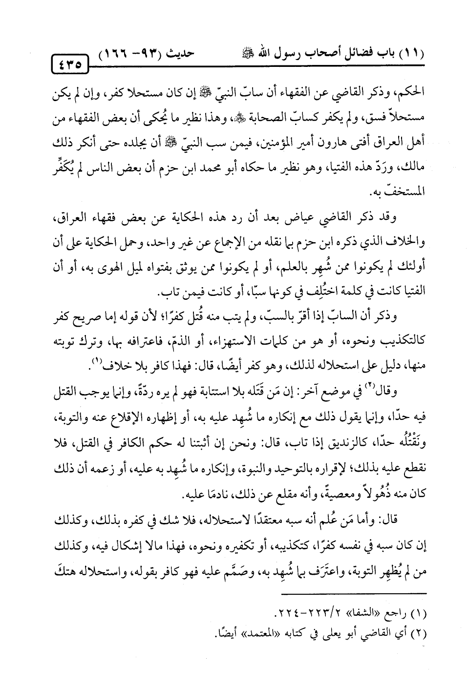 الحكم، وذكر القاضي عن الفقهاء أن سابّ النبيّ -صلى الله عليه وسلم- إن كان مستحلا كفر، وإن لم يكن مستحلًا فسق، ولم يكفر كسابّ الصّحابة -رضي الله عنهم-، وهذا نظير ما يُحكى أن بعض الفقهاء من أهل العراق أفتى هارون أمير المؤمنين، فيمن سب النبيّ -صلى الله عليه وسلم- أن يجلده حتّى أنكر ذلك مالك، ورَدّ هذه الفتيا، وهو نظير ما حكاه أبو محمّد ابن حزم أن بعض النَّاس لم يُكَفِّر المستخفّ به.