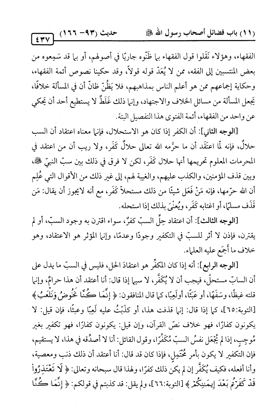 [الوجه الرّابع]: أنه إذا كان المكفِّر هو اعتقادَ الحل، فليس في السبّ ما يدلُّ على أن السابّ مستحلّ، فيجب أن لا يُكَفر، لا سيما إذا قال: أنا أعتقد أن هذا حرامٌ، وإنما قلته غيظًا، وسَفَهًا، أو عَبَثًا، أو لَعِبًا، كما قال المنافقون: {إِنَّمَا كُنَّا نَخُوضُ وَنَلْعَبُ} [التوبة: 65]، كما إذا قال: إنّما قذفت هذا، أو كذَبْتُ عليه لَعِبًا وعبثًا، فإن قيل: لا يكونون كفارًا، فهو خلاف نصّ القرآن، وإن قيل: يكونون كفارًا، فهو تكفير بغير مُوجِبٍ، إذا لم يُجْعَل نفسُ السبّ مُكَفِّرًا، وقول القائل: أنا لا أصدِّقه في هذا، لا يستقيم، فإن التكفير لا يكون بأمر محُتمِلٍ، فإذا كان قد قال: أنا أعتقد أن ذلك ذنب ومعصية، وأنا أفعله، فكيف يُكَفَّر إن لم يكن ذلك كفرًا، ولهذا قال سبحانه وتعالى: {لَا تَعْتَذِرُوا قَدْ كَفَرْتُمْ بَعْدَ إِيمَانِكُمْ} [التوبة: 66]، ولم يقل: قد كذبتم في قولكم: {إِنَّمَا كُنَّا