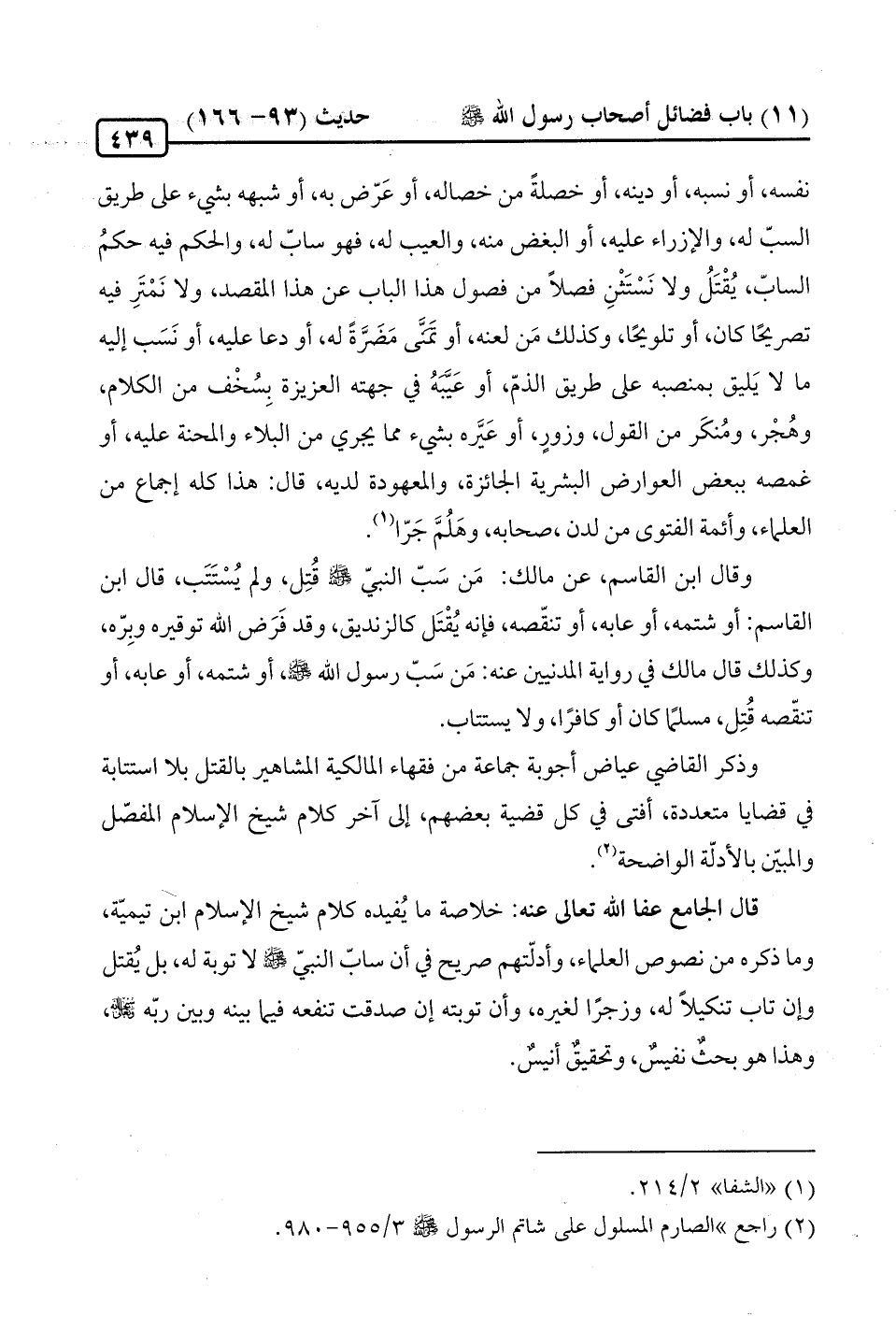 وذكر القاضي عياض أجوبة جماعة من فقهاء المالكية المشاهير بالقتل بلا استتابة في قضايا متعددة، أفتى في كلّ قضية بعضهم، إلى آخر كلام شيخ الإسلام المفصّل والمبيّن بالأدلّة الواضحة (¬2).