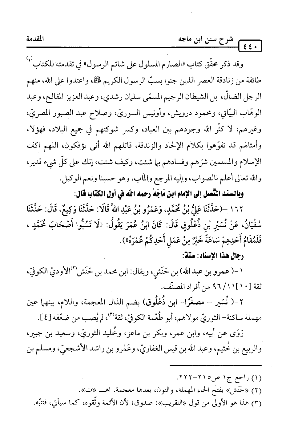 162 - (حَدَّثَنَا عِليُّ بْنُ مُحَمَّدٍ، وَعَمْرُو بْنُ عَبْدِ الله قَالَا: حَدَّثَنَا وَكِيع، قَالَ: حَدَّثَنَا سُفْيَانُ، عَنْ نُسَيْرِ بْنِ ذُعْلُوقٍ قَالَ: كَانَ ابْنُ عُمَرَ يَقُول: "لَا تَسُبُّوا أَصْحَابَ مُحَمَّدٍ، فَلَمُقَامُ أَحَدِهِمْ سَاعَةً خَيرٌ مِنْ عَمَلِ أَحَدِكُمْ عُمْرَهُ").