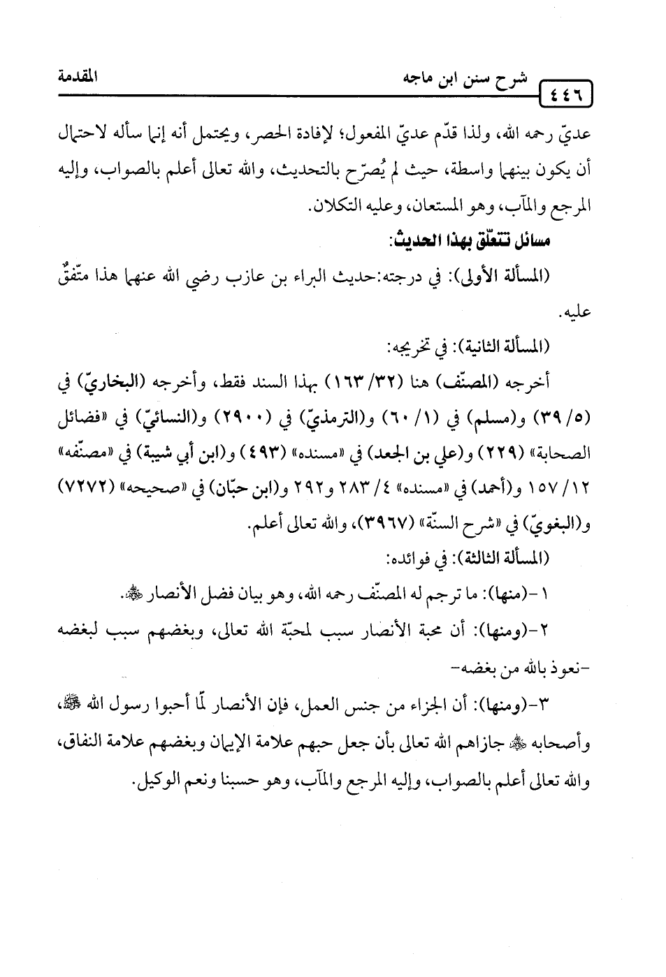 3 - (ومنها): أن الجزاء من جنس العمل، فإن الأنصار لمّا أحبوا رسول الله -صلى الله عليه وسلم-، وأصحابه -رضي الله عنهم- جازاهم الله تعالى بأن جعل حبهم علامة الإيمان وبغضهم علامة النفاق، والله تعالى أعلم بالصواب، وإليه المرجع والمآب، وهو حسبنا ونعم الوكيل.