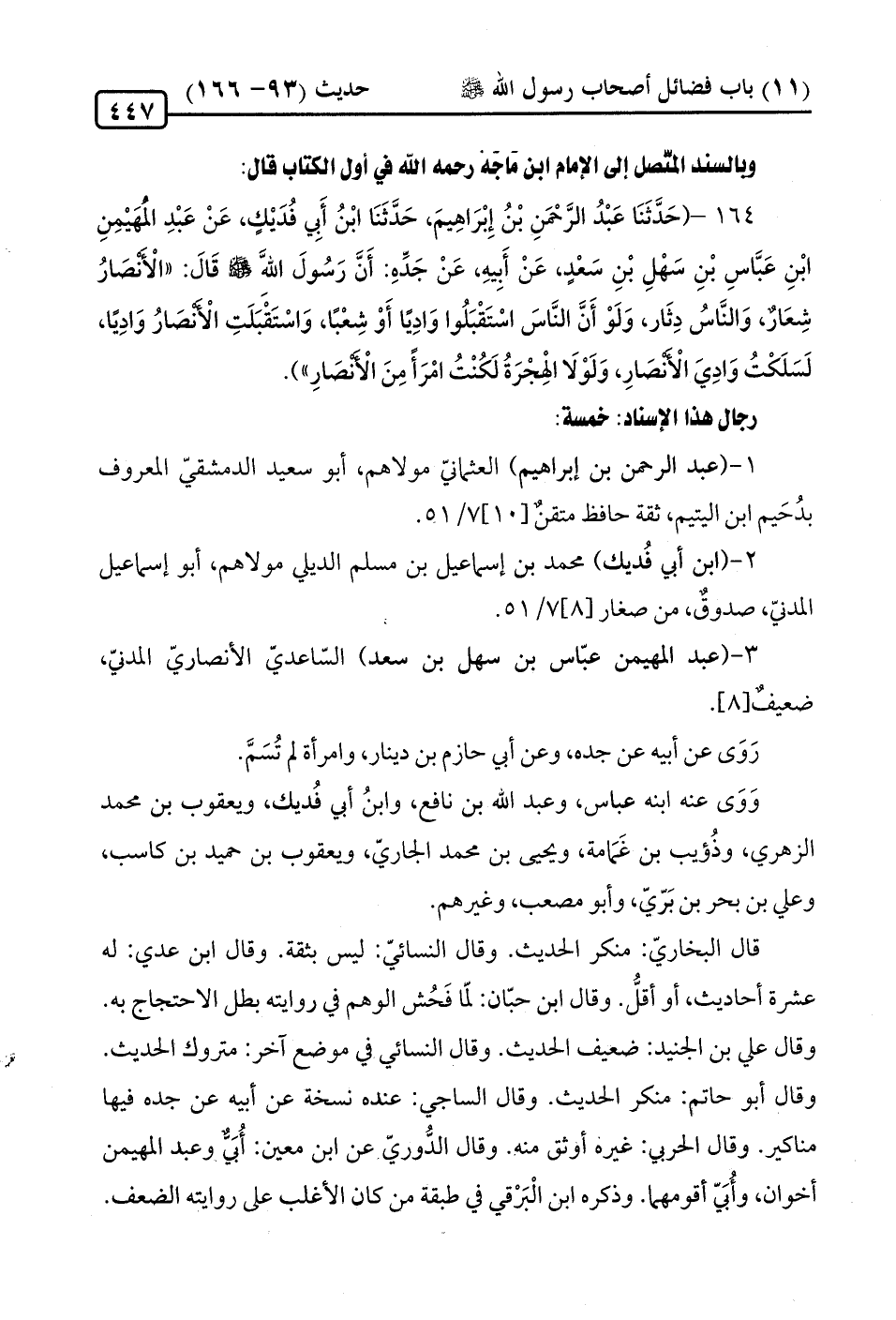 164 - (حَدَّثَنَا عَبْدُ الرَّحْمَنِ بْنُ إِبْرَاهِيمَ، حَدَّثَنَا ابْنُ أَبِي فُدَيْكٍ، عَنْ عَبْدِ الْمُهَيْمِنِ ابْنِ عَبَّاسِ بْنِ سَهْلِ بْنِ سَعْدٍ، عَنْ أَبِيهِ، عَنْ جَدِّهِ: أَنَّ رَسُولَ الله -صلى الله عليه وسلم- قَالَ: "الأَنْصَارُ شِعَارٌ، وَالنَّاسُ دِثَار، وَلَوْ أَنَّ النَّاسَ اسْتَقْبَلُوا وَادِيّا أَوْ شِعْبًا، وَاسْتَقبَلَتِ الأَنْصَارُ وَادِيًا، لَسَلَكْتُ وَادِيَ الأَنْصَارِ، وَلَوْلَا الهجْرَةُ لَكُنْتُ امْرَأً مِنَ الْأَنْصَارِ").