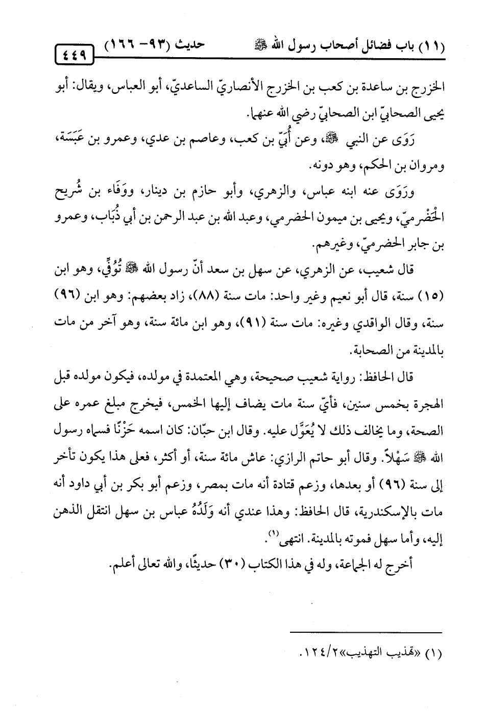 قال شعيب، عن الزّهريّ، عن سهل بن سعد أن رسول الله -صلى الله عليه وسلم- تُوُفِّي، وهو ابن (15) سنة، قال أبو نعيم وغير واحد: مات سنة (88)، زاد بعضهم: وهو ابن (96) سنة، وقال الواقدي وغيره: مات سنة (91)، وهو ابن مائة سنة، وهو آخر من مات بالمدينة من الصّحابة.