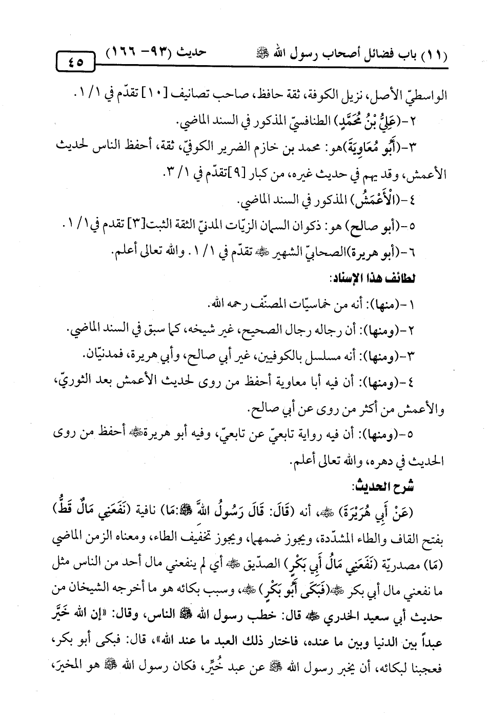 (عَنْ أَبِي هُرَيْرَةَ) -رضي الله عنه-، أنه (قَالَ: قَالَ رَسُولُ الله -صلى الله عليه وسلم-: مَا) نافية (نَفَعَني مَالٌ قَطُّ) بفتح القاف والطاء المشدّدة، ويجوز ضمهما، ويجوز تخفيف الطاء، ومعناه الزمن الماضي (مَا) مصدريّة (نَفَعَني مَالُ أَبِي بَكْرٍ) الصدّيق -رضي الله عنه- أي لم ينفعني مال أحد من الناس مثل ما نفعني مال أبي بكر -رضي الله عنه- (فَبَكَى أبو بَكْرٍ) -رضي الله عنه-، وسبب بكائه هو ما أخرجه الشيخان من حديث أبي سعيد الخدري -رضي الله عنه- قال: خطب رسول الله -صلى الله عليه وسلم- الناس، وقال: "إن الله خَيَّر عبدًا بين الدنيا وبين ما عنده، فاختار ذلك العبد ما عند الله"، قال: فبكى أبو بكر، فعجبنا لبكائه، أن يخبر رسول الله -صلى الله عليه وسلم- عن عبد خُيِّر، فكان رسول الله -صلى الله عليه وسلم- هو المخيرَ،