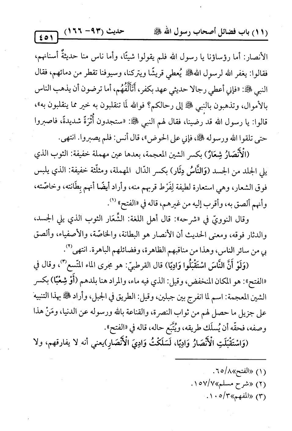 الأنصار: أما رؤساؤنا يا رسول الله فلم يقولوا شيئًا، وأما ناس منا حديثةٌ أسنانهم، فقالوا: يغفر الله لرسول الله -صلى الله عليه وسلم- يُعطي قريشًا ويتركنا، وسيوفنا تقطر من دمائهم، فقال النّبيّ -صلى الله عليه وسلم-: "فإني أعطي رجالا حديثي عهد بكفر، أَتَألَّفُهُم، أما ترضون أن يذهب النَّاس بالأموال، وتذهبون بالنبي -صلى الله عليه وسلم- إلى رحالكم؛ فوالله لمَا تنقلبون به خير ممّا ينقلبون به"، قالوا: يا رسول الله قد رضينا، فقال لهم النّبيّ -صلى الله عليه وسلم-: "ستجدون أَثَرَةً شديدةً، فاصبروا حتّى تلقوا الله ورسوله -صلى الله عليه وسلم-، فإني على الحوض"، قال أنس: فلم يصبروا. انتهى.