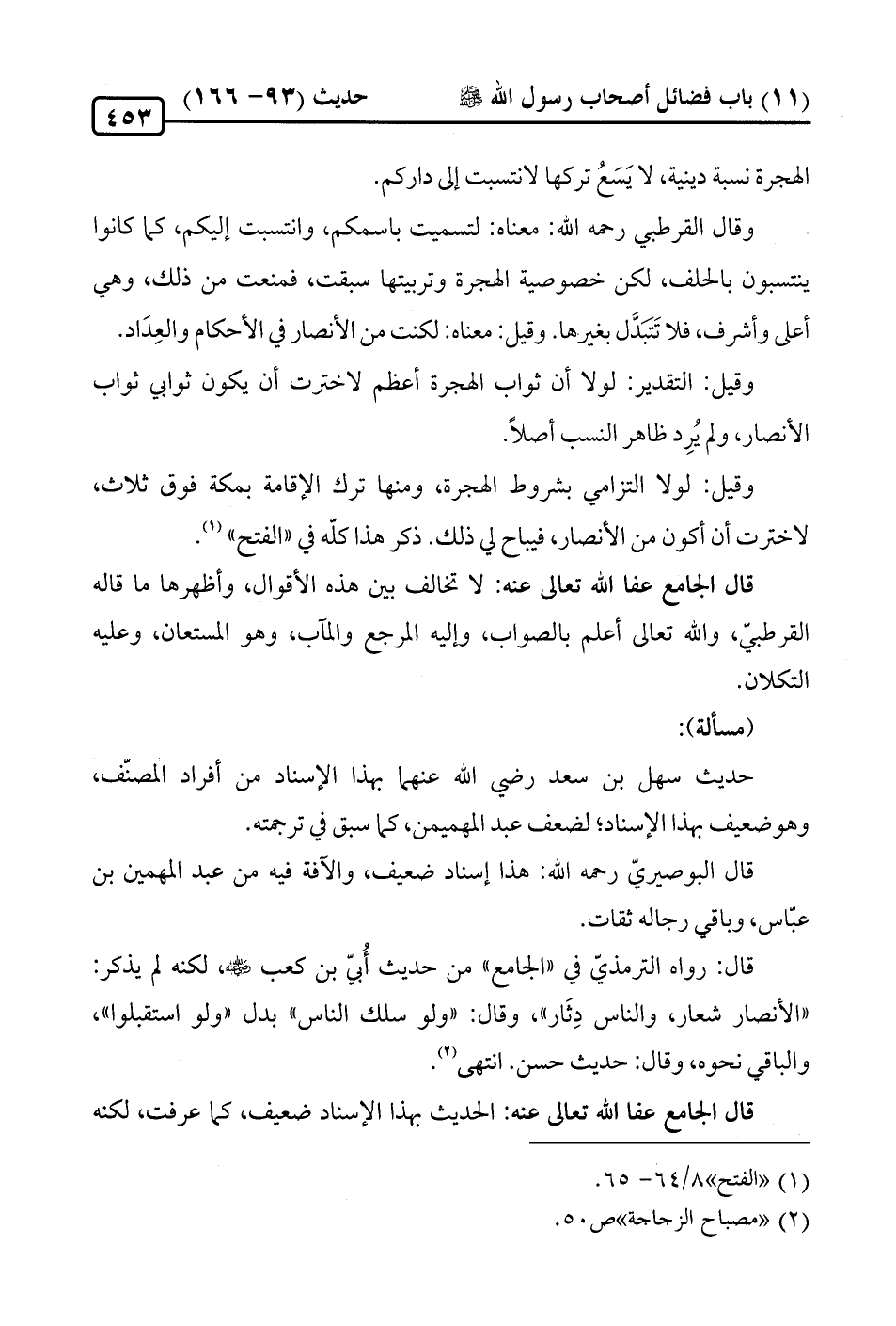 وقال القرطبي رحمه الله: معناه: لتسميت باسمكم، وانتسبت إليكم، كما كانوا ينتسبون بالحلف، لكن خصوصية الهجرة وتربيتها سبقت، فمنعت من ذلك، وهي أعلى وأشرف، فلا تَتبَدَّل بغيرها. وقيل: معناه: لكنت من الأنصار في الأحكام والعِدَاد.