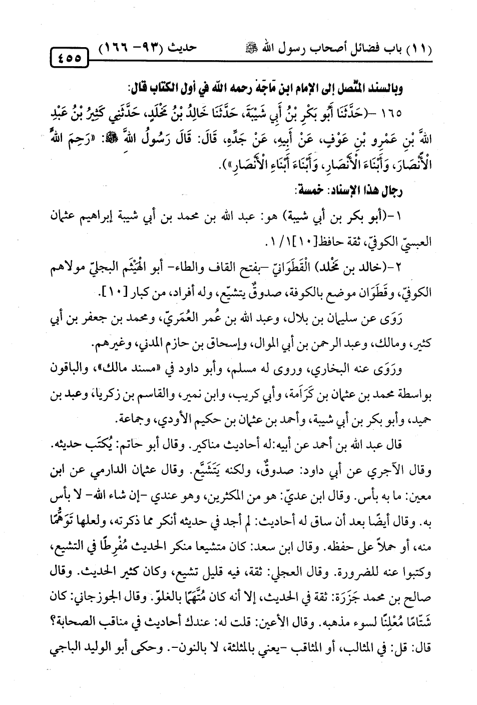 165 - (حَدَّثَنَا أَبُو بَكْرِ بْنُ أَبِي شَيْبَةَ، حَدَّثَنَا خَالِدُ بْنُ مَخْلَدٍ، حَدَّثَني كَثِيرُ بْنُ عَبْدِ الله بْنِ عَمْرِو بْنِ عَوْفٍ، عَنْ أَبِيهِ، عَنْ جَدِّهِ، قَالَ: قَالَ رَسُولُ الله -صلى الله عليه وسلم-: "رَحِمَ الله الأَنْصَارَ، وَأَبْنَاءَ الأَنْصارِ، وَأَبْنَاءَ أَبْنَاءِ الأَنْصارِ").
