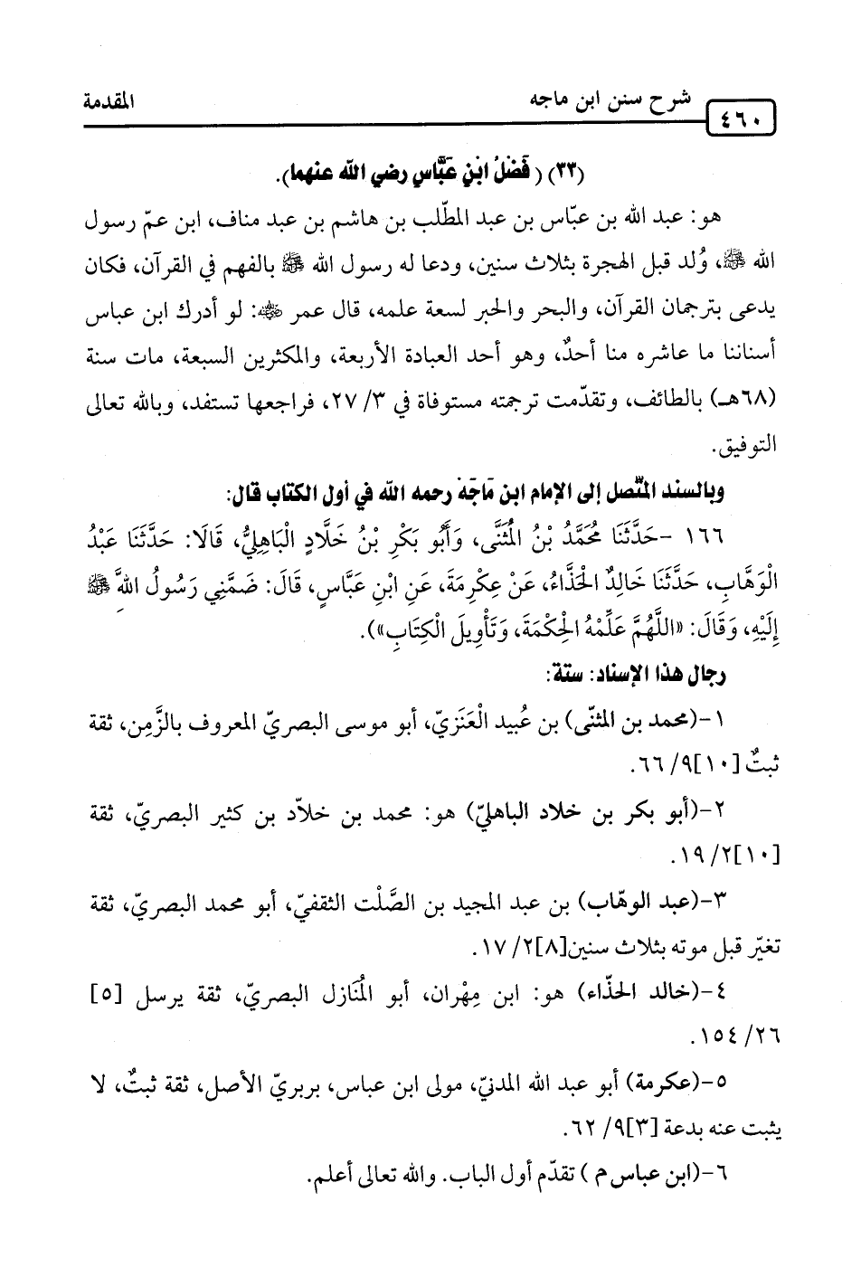 166 - حَدَّثَنَا مُحَمَّدُ بْنُ المُثَنَّى، وأَبُو بَكْرِ بْنُ خَلَّادٍ الْبَاهِليُّ، قَالَا: حَدَّثَنَا عَبْدُ الْوَهَّابِ، حَدَّثَنَا خَالِدٌ الْحَذَّاءُ، عَنْ عِكْرِمَةَ، عَنِ ابْنِ عَبَّاسٍ، قَالَ: ضَمَّنِي رَسُولُ الله -صلى الله عليه وسلم- إِلَيْهِ، وَقَالَ: "اللَّهُمَّ عَلِّمْهُ الْحِكْمَةَ، وَتَأْوِيلَ الْكِتَابِ").