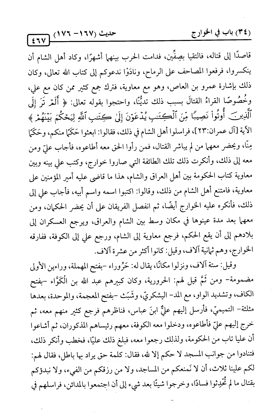 قاصدًا إلى قتاله، فالتقيا بصِفِّين، فدامت الحرب بينهما أشهرًا، وكاد أهل الشّام أن ينكسروا، فرفعوا المصاحف على الرماح، ونادَوْا ندعوكم إلى كتاب الله تعالى، وكان ذلك بإشارة عمرو بن العاص، وهو مع معاوية، فترك جمع كثير ممّن كان مع علي، وخُصُوصًا القراءُ القتالَ بسبب ذلك تديُّنًا، واحتجوا بقوله تعالى: {أَلَمْ تَرَ إِلَى الَّذِينَ أُوتُوا نَصِيبًا مِنَ الْكِتَابِ يُدْعَوْنَ إِلَى كِتَابِ اللَّهِ لِيَحْكُمَ بَيْنَهُمْ} الآية [آل عمران: 23]، فراسلوا أهل الشّام في ذلك، فقالوا: ابعثوا حَكَمًا منكم، وحَكَمًا مِنّا، ويحضر معهما من لم يباشر القتال، فمن رأوا الحق معه أطاعوه، فأجاب عليّ ومن معه إلى ذلك، وأنكرت ذلك تلك الطائفة الّتي صاروا خوارج، وكتب علي بينه وبين معاوية كتاب الحكومة بين أهل العراق والشام، هذا ما قاضى عليه أمير المؤمنين على معاوية، فامتنع أهل الشّام من ذلك، وقالوا: اكتبوا اسمه واسم أبيه، فأجاب عليّ إلى ذلك، فأنكره عليه الخوارج أيضًا، ثمّ انفصل الفريقان على أن يحضر الحكمان، ومن معهما بعد مدة عينوها في مكان وسط بين الشّام والعراق، ويرجع العسكران إلى بلادهم إلى أن يقع الحكم، فرجع معاوية إلى الشّام، ورجع علي إلى الكوفة، ففارقه الخوارج، وهم ثمانية آلاف، وقيل: كانوا أكثر من عشرة آلاف.