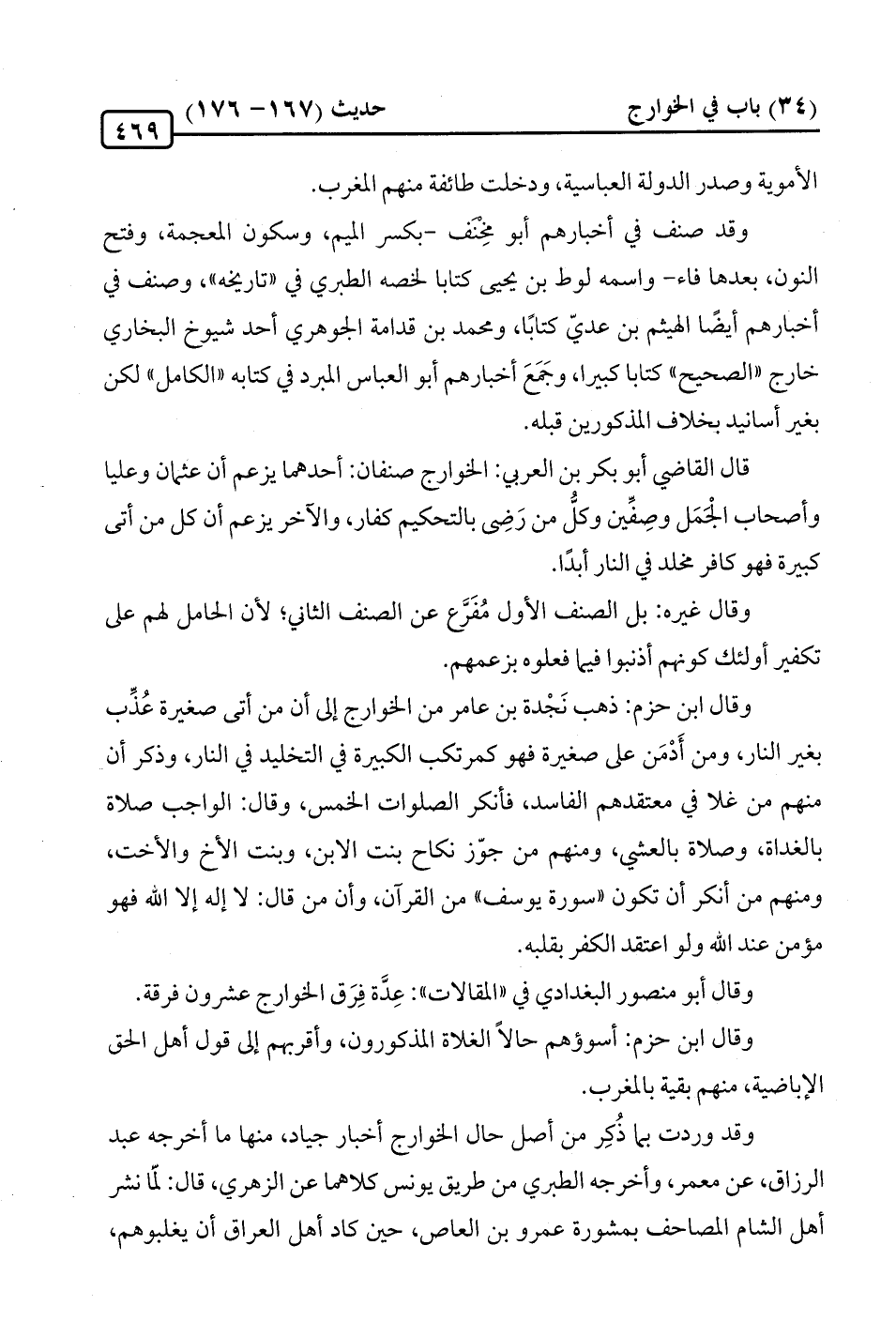 قال القاضي أبو بكر بن العربي: الخوارج صنفان: أحدهما يزعم أن عثمان وعليا وأصحاب الْجَمَل وصِفِّين وكلُّ من رَضِي بالتحكيم كفار، والآخر يزعم أن كلّ من أتى كبيرة فهو كافر مخلد في النّار أبدًا.