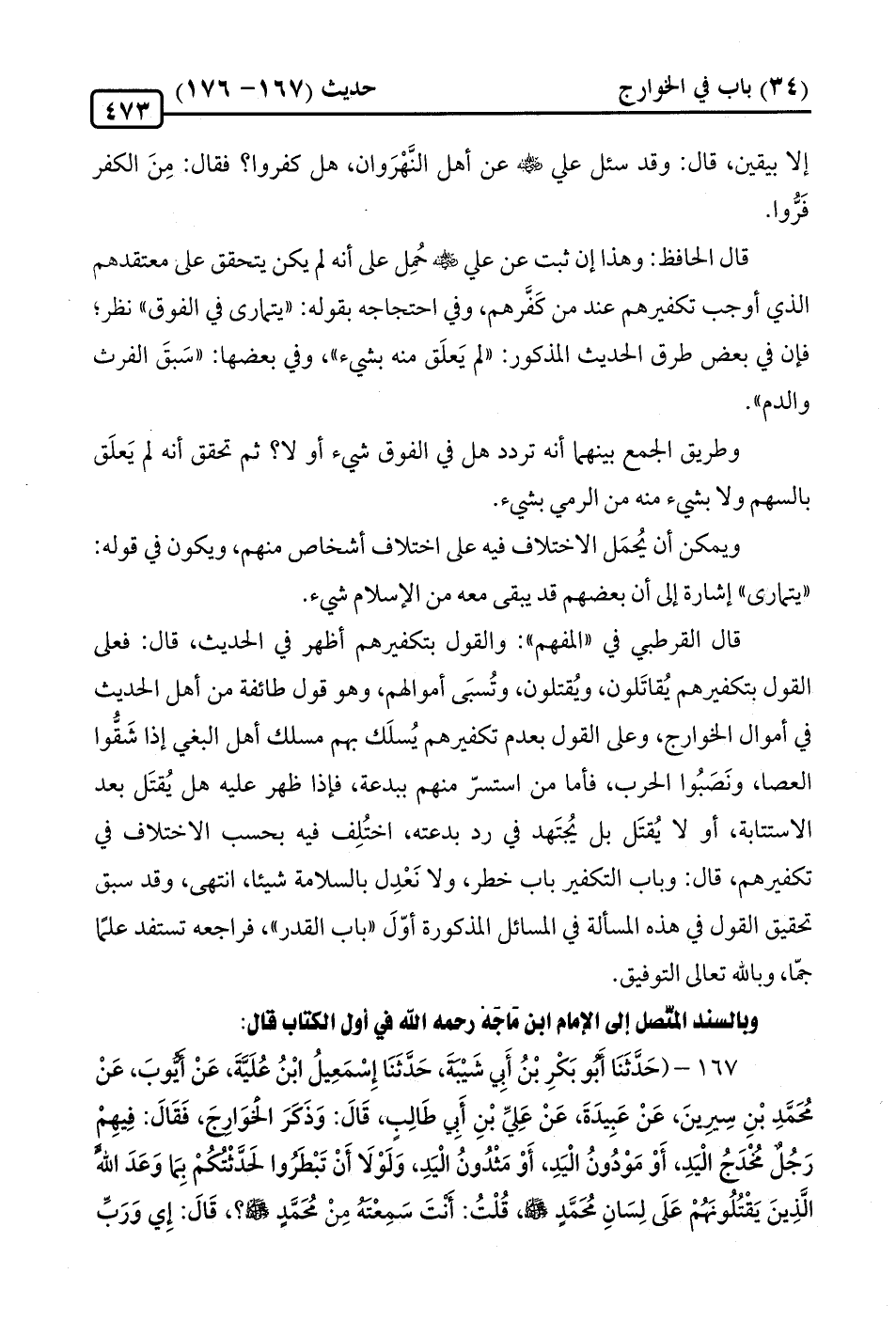 قال الحافظ: وهذا إن ثبت عن علي -رضي الله عنه- حُمِل على أنه لم يكن يتحقق على معتقدهم الّذي أوجب تكفيرهم عند من كَفَّرهم، وفي احتجاجه بقوله: "يتمارى في الفوق" نظر؛ فإن في بعض طرق الحديث المذكور: "لم يَعلَق منه بشيء"، وفي بعضها: "سَبقَ الفرث والدم".