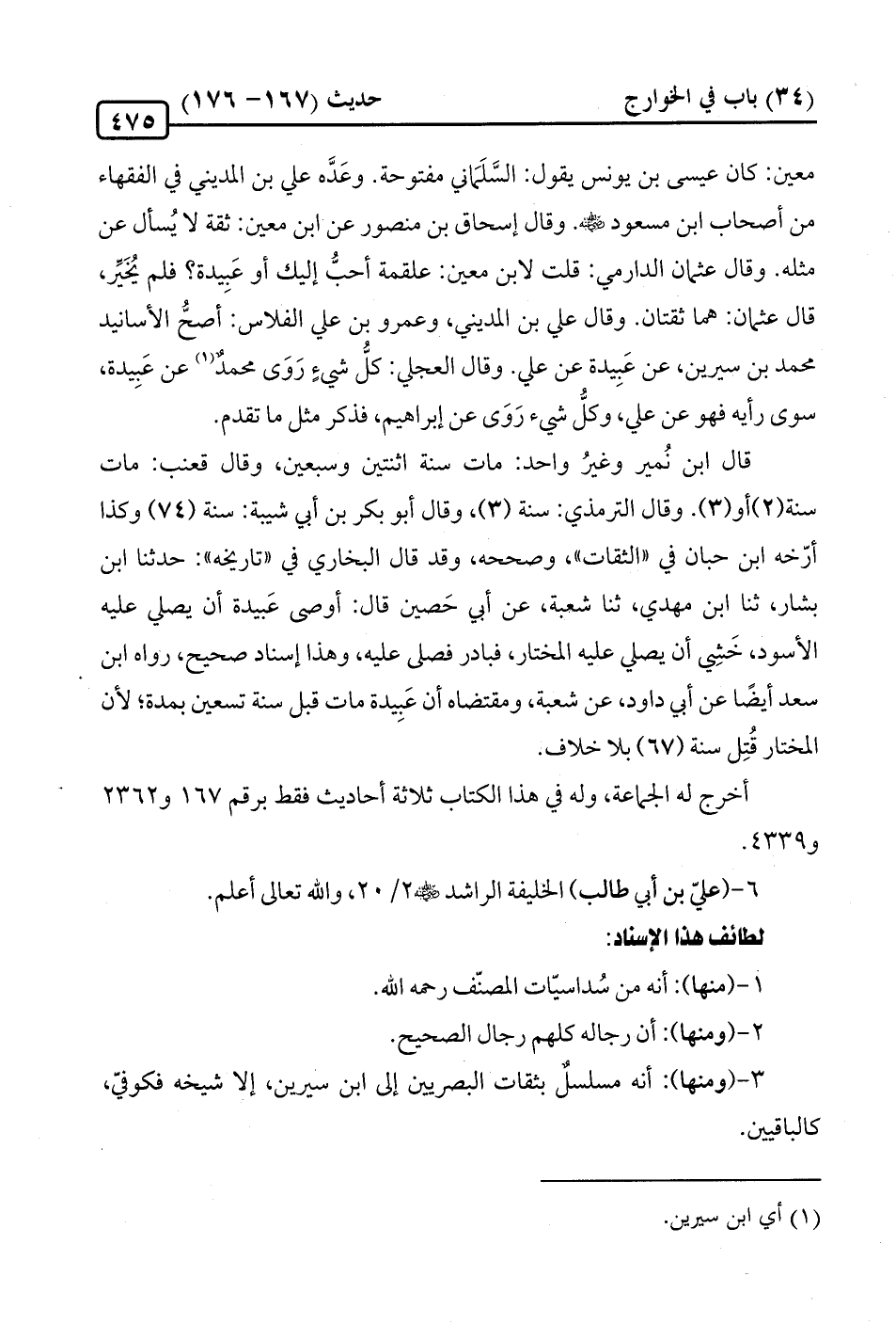 معين: كان عيسى بن يونس يقول: السَّلَمَاني مفتوحة. وعَدَّه علي بن المديني في الفقهاء من أصحاب ابن مسعود -رضي الله عنه-. وقال إسحاق بن منصور عن ابن معين: ثقة لا يُسأل عن مثله. وقال عثمان الدارمي: قلت لابن معين: علقمة أحبُّ إليك أو عَبِيدة؟ فلم يُخَيَّر، قال عثمان: هما ثقتان. وقال علي بن المديني، وعمرو بن علي الفلاس: أصحُّ الأسانيد محمّد بن سيرين، عن عَبِيدة عن علي. وقال العجلي: كلّ شيءٍ رَوَى محمدٌ (¬1) عن عَبِيدة، سوى رأيه فهو عن علي، وكلُّ شيء رَوَى عن إبراهيم، فذكر مثل ما تقدّم.