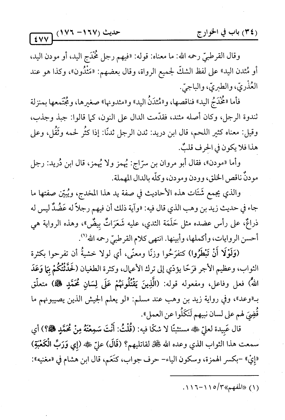 وقال القرطبيّ رحمه الله: ما معناه: قوله: "فيهم رجل مُخْدَج اليد، أو مودن اليد، أو مُثدن اليد" على لفظ الشكّ لجميع الرواة، وقال بعضهم: "مَثْدُون"، وكذا هو عند العُذْريّ، والطّبريّ، والباجيّ.