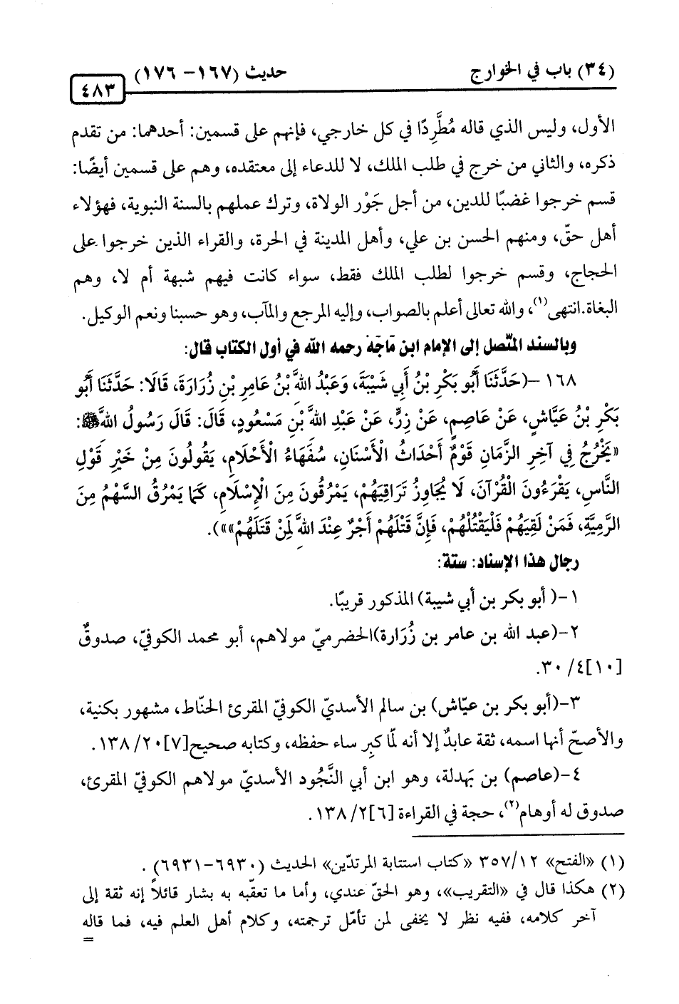 168 - (حَدَّثَنَا أَبُو بَكْرِ بْنُ أَبِي شَيْبَةَ، وَعَبْدُ الله بْنُ عَامِرِ بْنِ زُرَارَةَ، قَالَا: حَدَّثَنَا أَبُو بَكْرِ بْنُ عَيَّاشٍ، عَنْ عَاصِمٍ، عَنْ زِرٍّ، عَنْ عَبْدِ الله بْنِ مَسْعُودٍ، قَالَ: قَالَ رَسُولُ الله -صلى الله عليه وسلم-: "يَخْرُجُ في آخِرِ الزَّمَانِ قَوْمٌ أَحْدَاثُ الْأَسْنَانِ، سُفَهَاءُ الْأَحْلَامِ، يَقُولُونَ مِنْ خَيْرِ قَوْلِ النَّاسِ، يَقْرَءُونَ الْقُرْآنَ، لَا يُجَاوِزُ تَرَاقِيَهُمْ، يَمْرُقُونَ مِنَ الإسْلَامِ، كَمَا يَمْرُقُ الْسَّهْمُ مِنَ الرَّمِيَّةِ، فَمَنْ لَقِيَهُمْ فَلْيَقْتُلْهُمْ، فَإِنَّ قَتْلَهُمْ أَجْرٌ عِنْدَ الله لمِنْ قَتَلَهُمْ").