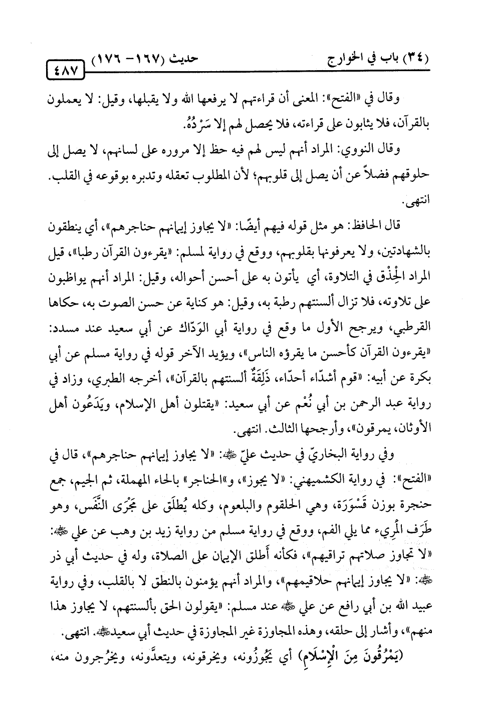 وفي رواية البخاريّ في حديث عليّ -رضي الله عنه-: "لا يجاوز إيمانهم حناجرهم"، قال في "الفتح": في رواية الكشميهني: "لا يجوز"، و"الحناجر" بالحاء المهملة، ثمّ الجيم، جمع حنجرة بوزن قَسْوَرَة، وهي الحلقوم والبلعوم، وكله يُطلَق على مَجْرَى النَّفَس، وهو طَرَف الْمَرِيء ممّا يلي الفم، ووقع في رواية مسلم من رواية زيد بن وهب عن علي -رضي الله عنه-: "لا تجاوز صلاتهم تراقيهم"، فكأنه أَطلق الإيمان على الصّلاة، وله في حديث أبي ذر -رضي الله عنه-: "لا يجاوز إيمانهم حلاقيمهم"، والمراد أنهم يؤمنون بالنطق لا بالقلب، وفي رواية عبيد الله بن أبي رافع عن علي -رضي الله عنه- عند مسلم: "يقولون الحق بألسنتهم، لا يجاوز هذا منهم"، وأشار إلى حلقه، وهذه المجاوزة غير المجاوزة في حديث أبي سعيد -رضي الله عنه-. انتهى.