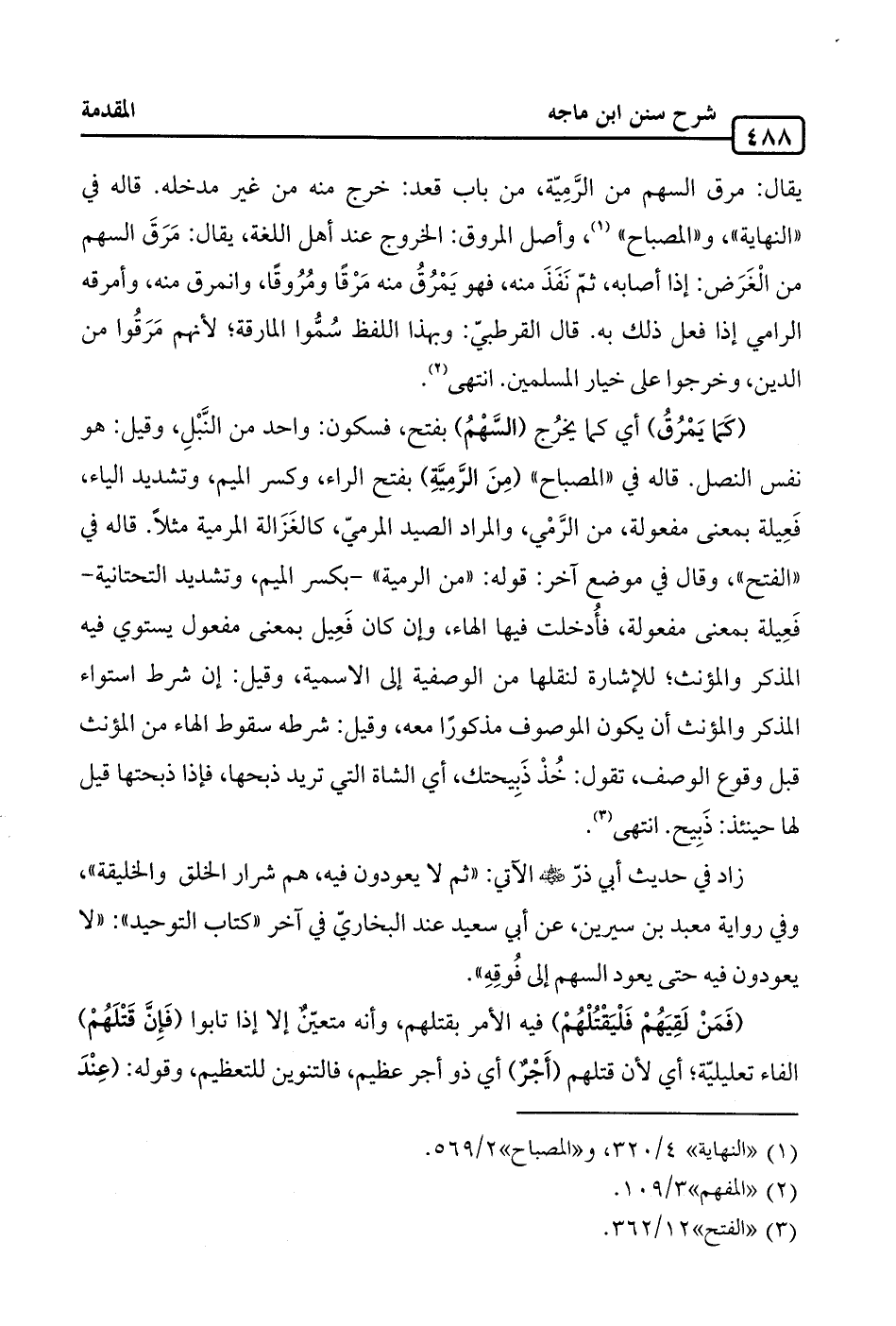 (كَمَا يَمْرُقُ) أي كما يخرُج (السَّهْمُ) بفتح، فسكون: واحد من النَّبْلِ، وقيل: هو نفس النصل. قاله في "المصباح" (مِنَ الرَّمِيَّةِ) بفتح الراء، وكسر الميم، وتشديد الياء، فَعِيلة بمعنى مفعولة، من الرَّمْي، والمراد الصَّيد المرميّ، كالغَزَالة المرمية مثلًا. قاله في "الفتح"، وقال في موضع آخر: قوله: "من الرمية" -بكسر الميم، وتشديد التحتانية- فَعِيلة بمعنى مفعولة، فأدخلت فيها الهاء، وإن كان فَعِيل بمعنى مفعول يستوي فيه المذكر والمؤنث؛ للإشارة لنقلها من الوصفية إلى الاسمية، وقيل: إن شرط استواء المذكر والمؤنث أن يكون الموصوف مذكورًا معه، وقيل: شرطه سقوط الهاء من المؤنث قبل وقوع الوصف، تقول: خُذْ ذَبِيحتك، أي الشاة الّتي تريد ذبحها، فإذا ذبحتها قيل لها حينئذ: ذَبِيح. انتهى (¬3).