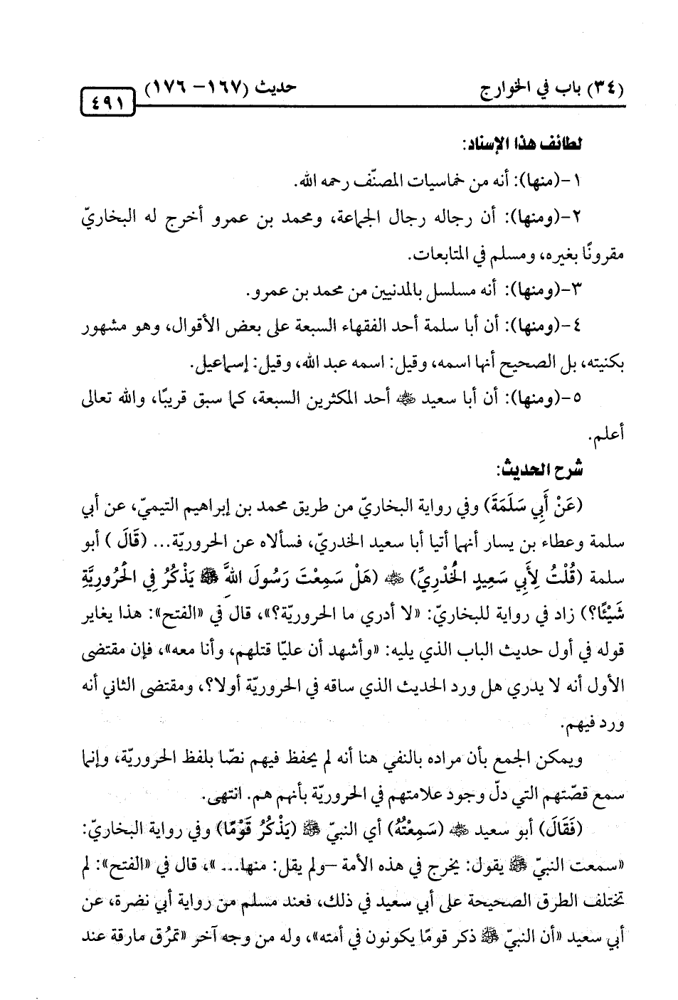 (عَنْ أَبِي سَلَمَةَ) وفي رواية البخاريّ من طريق محمّد بن إبراهيم التيميّ، عن أبي سلمة وعطاء بن يسار أنهما أتيا أبا سعيد الخدريّ، فسألاه عن الحروريّة ... (قالَ) أبو سلمة (قُلْتُ لِأَبِي سَعِيدٍ الْخُدْرِيِّ) -رضي الله عنه- (هَلْ سَمِعْتَ رَسُولَ الله -صلى الله عليه وسلم- يَذْكُرُ في الْحُرُورِيَّةِ شَيْئًا؟) زاد في رواية للبخاريّ: "لا أدري ما الحروريّة؟ "، قالَ في "الفتح": هذا يغاير قوله في أول حديث الباب الّذي يليه: "وأشهد أن عليّا قتلهم، وأنا معه"، فإن مقتضى الأوّل أنه لا يدري هل ورد الحديث الّذي ساقه في الحروريّة أولا؟، ومقتضى الثّاني أنه ورد فيهم.