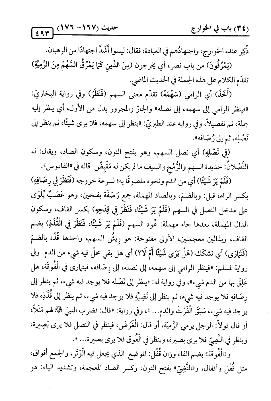 (يَمْرُقُونَ) من باب نصر، أي يخرجون (مِنَ الدِّينِ كما يَمْرُقُ السَّهْمُ مِنَ الرَّمِيَّةِ) تقدّم الكلام على هذه الجملة في الحديث الماضي.