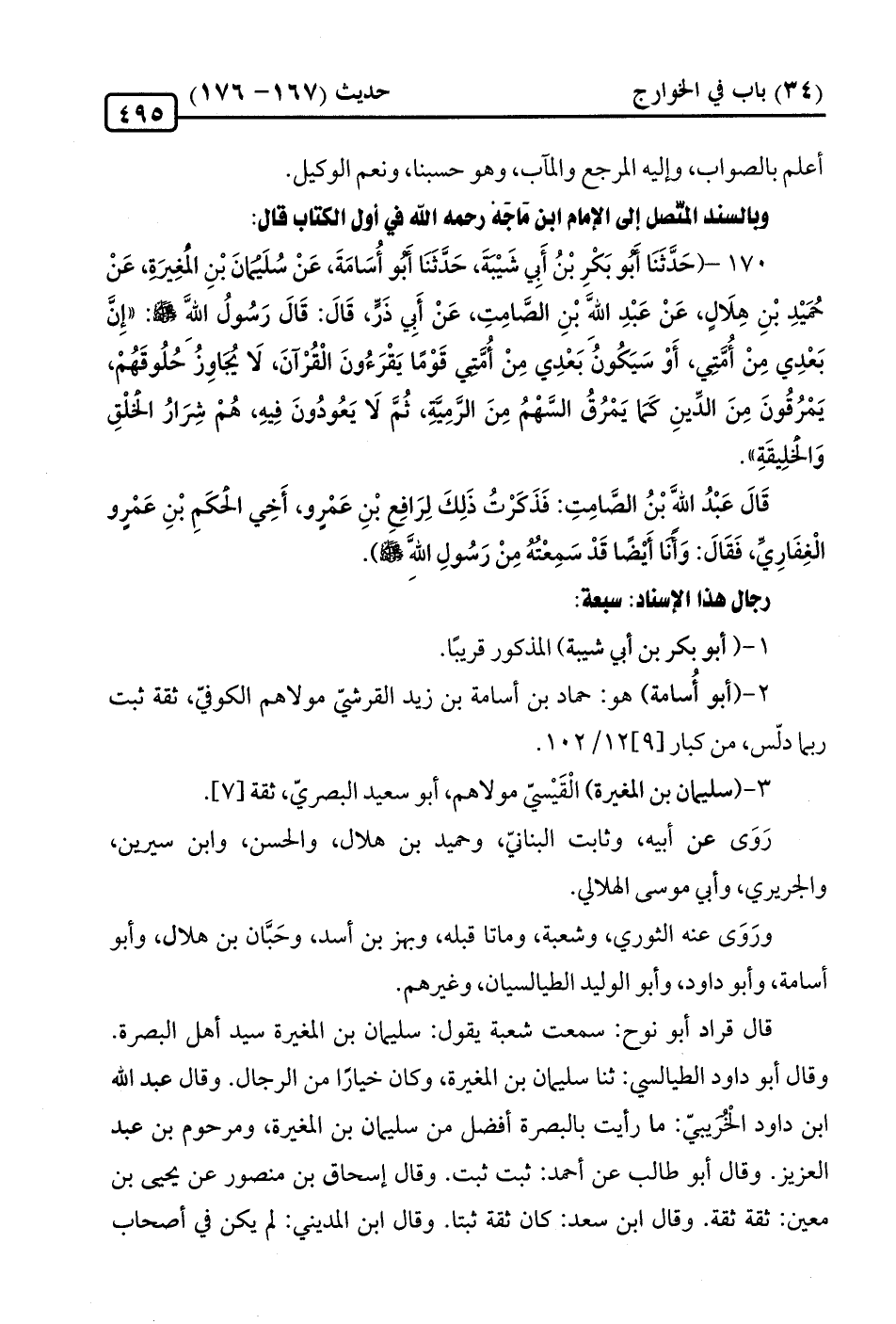 175 - (حَدَّثَنَا أَبُو بَكْرِ بْنُ أَبِي شَيْبَةَ، حَدَّثَنَا أَبُو أُسَامَةَ، عَنْ سُلَيْمَانَ بْنِ الْمُغِيرَةِ، عَنْ حُمَيْدِ بْنِ هِلَالٍ، عَنْ عَبْدِ الله بْنِ الصَّامِتِ، عَنْ أَبِي ذَرٍّ، قَالَ: قَالَ رَسُولُ الله -صلى الله عليه وسلم-: "إِن بَعْدِي مِنْ أُمَّتِي، أَوْ سَيَكُونُ بَعْدِي مِنْ أُمَّتِي قَوْمًا يَقْرَءُونَ الْقُرْآنَ، لَا يُجَاوِزُ حُلُوقَهُمْ، يَمْرُقُونَ مِنَ الدِّينِ كَما يَمْرُقُ السَّهْمُ مِنَ الرَّمِيَّةِ، ثُمَّ لَا يَعُودُونَ فِيهِ، هُمْ شِرَارُ الْخَلْقِ وَالخلِيقَةِ".