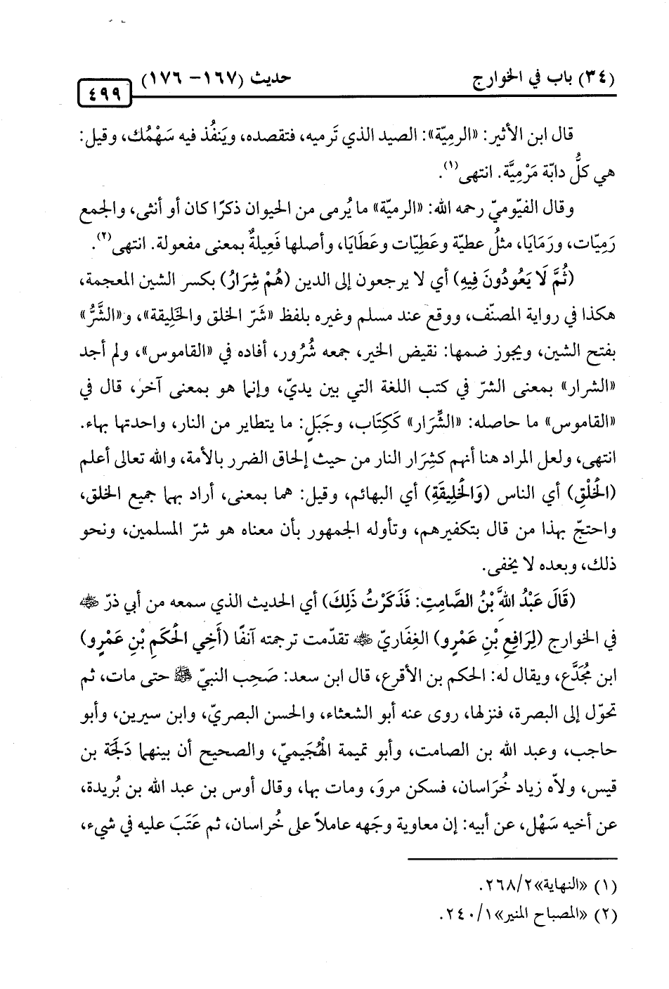 (ثُمَّ لَا يَعُودُونَ فِيهِ) أي لا يرجعون إلى الدين (هُمْ شِرَارُ) بكسر الشين المعجمة، هكذا في رواية المصنّف، ووقع عند مسلم وغيره بلفظ "شَرّ الخلق والجلِيقة"، و"الشَّرُّ" بفتح الشين، ويجوز ضمها: نقيض الخير، جمعه شُرُور، أفاده في "القاموس"، ولم أجد "الشرار" بمعنى الشرّ في كتب اللُّغة الّتي بين يديّ، وإنّما هو بمعنى آخر، قال في "القاموس" ما حاصله: "الشِّرَار" كَكِتَاب، وجَبَلٍ: ما يتطاير من النّار، واحدتها بهاء. انتهى، ولعلّ المراد هنا أنهم كشِرَار النّار من حيث إلحاق الضرر بالأمة، والله تعالى أعلم (الخَلْقِ) أي النَّاس (وَالخَلِيقَةِ) أي البهائم، وقيل: هما بمعنى، أراد بهما جميع الخلق، واحتجّ بهذا من قال بتكفيرهم، وتأوله الجمهور بأن معناه هو شرّ المسلمين، ونحو ذلك، وبعده لا يخفى.
