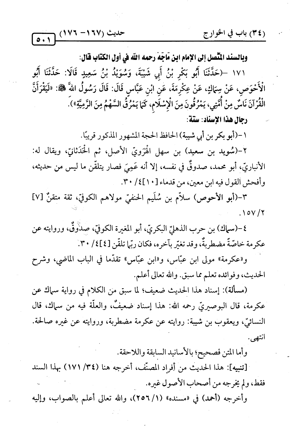 171 - (حَدَّثَنَا أَبُو بَكْرِ بْنُ أَبِي شَيْبَةَ، وَسُوَيْدُ بْنُ سَعِيدٍ قَالَا: حَدَّثَنَا أَبُو الْأَحْوَصِ، عَنْ سِمَاكٍ، عَنْ عِكْرِمَةَ، عَنِ ابْنِ عَبَّاسٍ قَالَ: قَالَ رَسُولُ الله -صلى الله عليه وسلم-: "لَيَقْرَأَنَّ الْقُرْآنَ نَاسٌ مِنْ أُمَّتِي، يَمْرُقُونَ مِنَ الْإِسْلَامِ، كمَا يَمْرُقُ السَّهْمُ مِنَ الرَّمِيَّةِ").