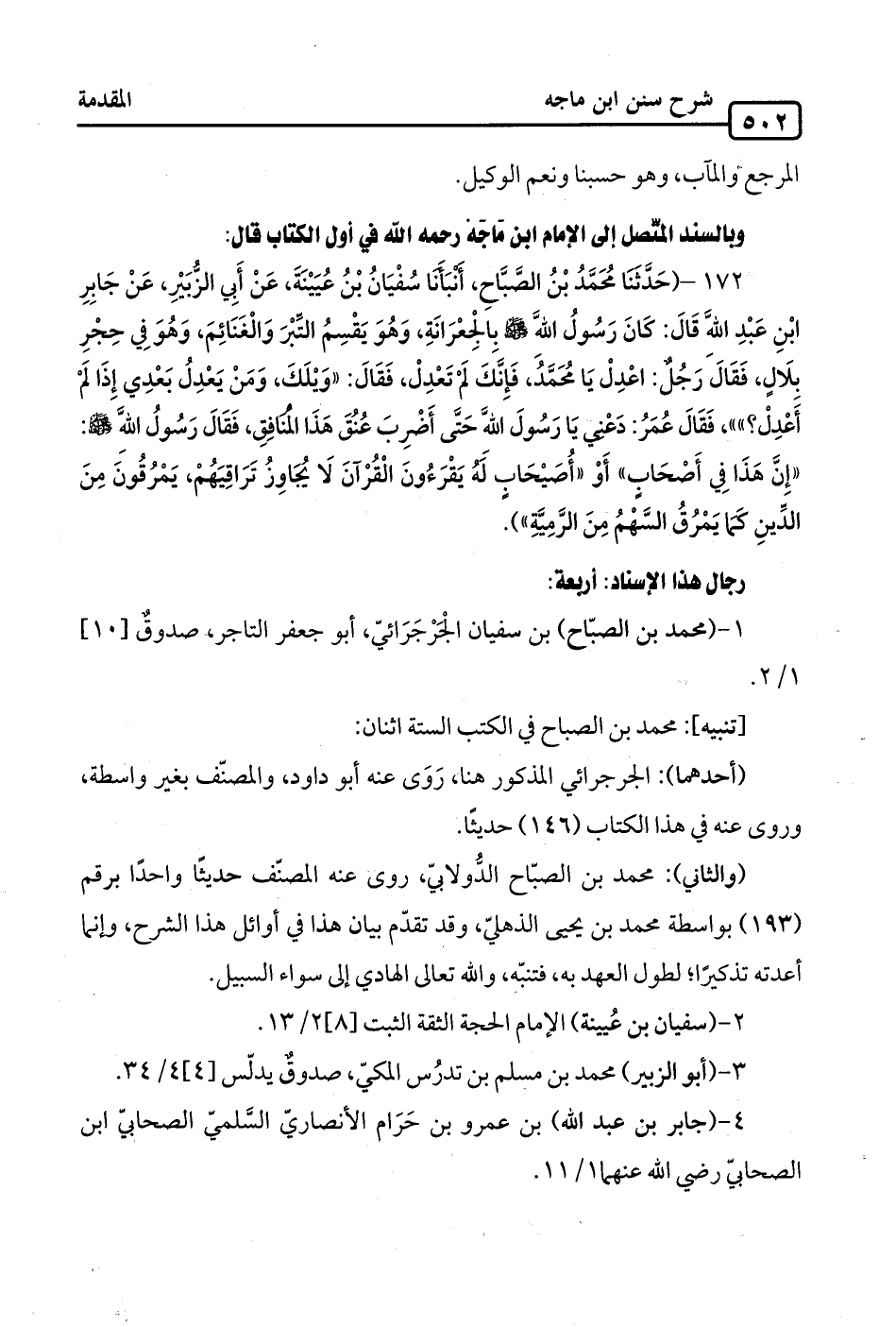 172 - (حَدَّثَنَا مُحَمَّدُ بْنُ الصَّبَاحِ، أنبَأَنَا سُفْيَانُ بْنُ عُيَيْنَةَ، عَنْ أَبِي الزُّبَيْرِ، عَنْ جَابِرِ ابْنِ عَبْدِ الله قَالَ: كَانَ رَسُولُ الله -صلى الله عليه وسلم- بالجعْرَانَةِ، وَهُوَ يَقْسِمُ التِّبْرَ وَالْغَنَائِمَ، وَهُوَ في حِجْرِ بلَالٍ، فَقَالَ رَجُلٌ: اعْدِلْ يَا مُحَمَّدُ، فَإِنَّك لَمْ تَعْدِلْ، فَقَالَ: "وَيْلَكَ، وَمَنْ يَعْدِلُ بَعْدِي إِذَا لَمْ أَعْدِلْ؟ "، فَقَالَ عُمَرُ: دَعْني يَا رَسُولَ الله حَتَّى أَضرِبَ عُنُقَ هَذَا المنافِقِ، فَقَالَ رَسُولُ الله -صلى الله عليه وسلم-: "إِنَّ هَذَا في أَصْحَابٍ" أَوْ "أُصَيْحَابٍ لَهُ يَقْرَءُونَ الْقُرْآنَ لَا يُجَاوِزُ تَرَاقِيَهُمْ، يَمْرُقُونَ مِنَ الدِّينِ كَما يَمْرُقُ السَّهْمُ مِنَ الرَّمِيَّةِ").
