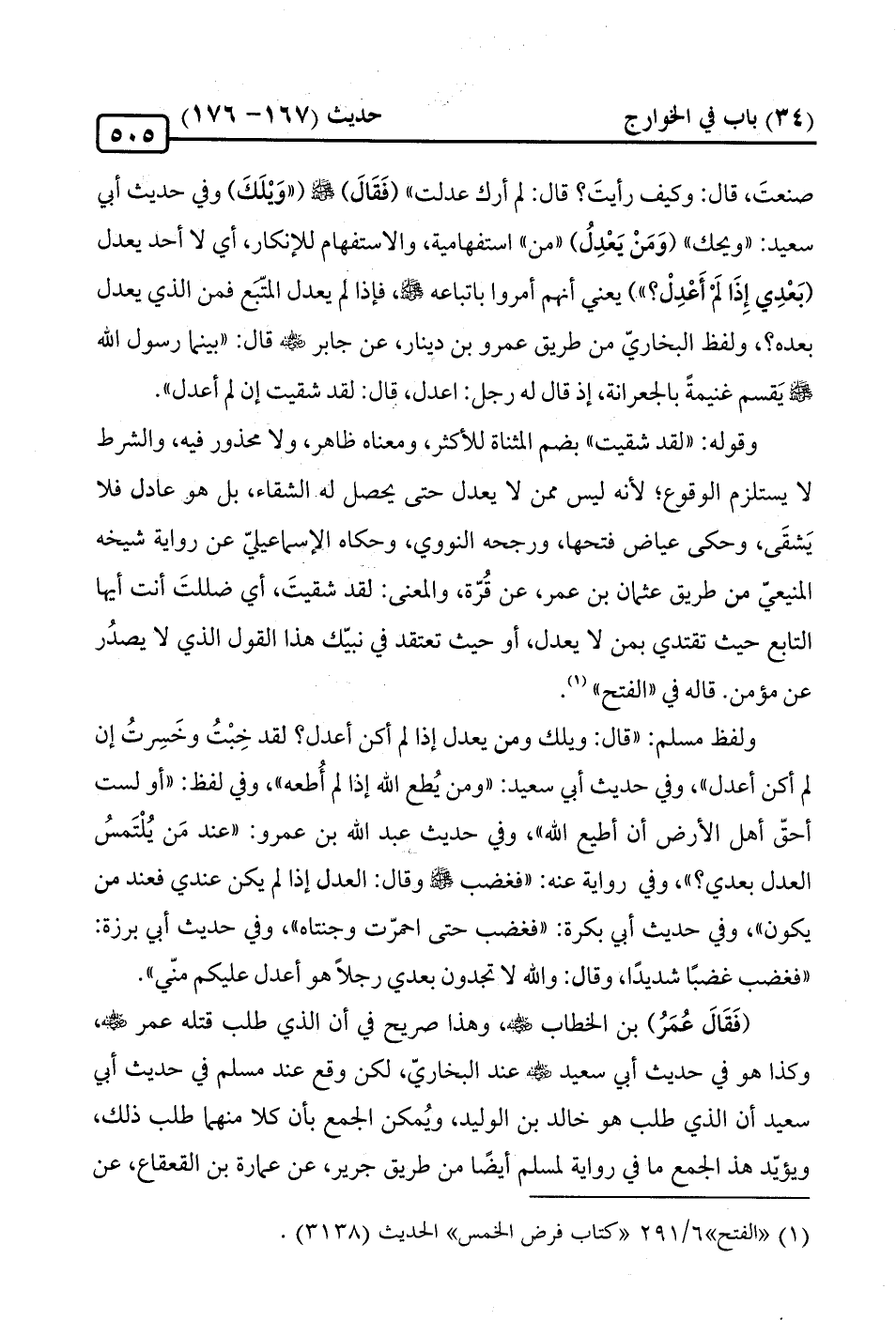 ولفظ مسلم: "قال: ويلك ومن يعدل إذا لم أكن أعدل؟ لقد خِبْتُ وخَسِرتُ إن لم أكن أعدل"، وفي حديث أبي سعيد: "ومن يُطع الله إذا لم أُطعه"، وفي لفظ: "أو لست أحقّ أهل الأرض أن أطيع الله"، وفي حديث عبد الله بن عمرو: "عند مَنْ يُلْتَمسُ العدل بعدي؟ "، وفي رواية عنه: "فغضب -صلى الله عليه وسلم- وقال: العدل إذا لم يكن عندي فعند من يكون"، وفي حديث أبي بكرة: "فغضب حتّى احمرّت وجنتاه"، وفي حديث أبي برزة: "فغضب غضبًا شديدًا، وقال: والله لا تجدون بعدي رجلًا هو أعدل عليكم منّي".