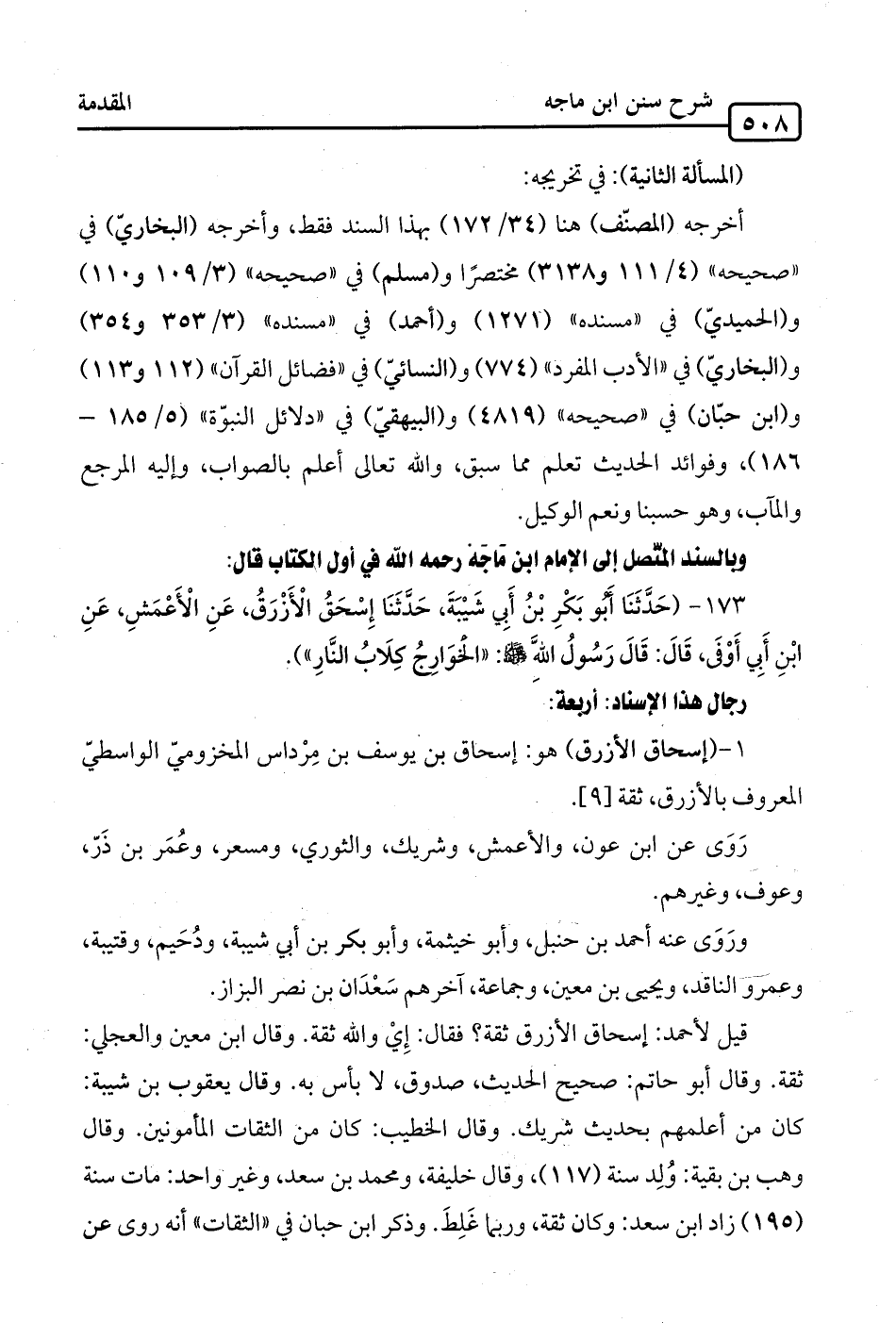 173 - (حَدَّثَنَا أَبُو بَكْرِ بْنُ أَبِي شَيْبَةَ، حَدَّثَنَا إِسْحَقُ الْأَزْرَقُ، عَنِ الْأَعْمَشِ، عَنِ ابْنِ أَبِي أَوْفَى، قَالَ: قَالَ رَسُولُ الله -صلى الله عليه وسلم-: "الخَوَارِجُ كِلَابُ النَّارِ").