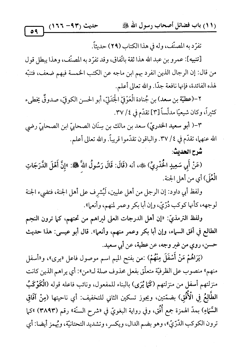 ولفظ الترمذيّ: "إن أهل الدرجات العلى ليراهم من تحتهم، كما ترون النجم الطالع في أفق السماء، وإن أبا بكر وعمر منهم، وأنعما". قال أبو عيسى: هذا حديث حسن، روي من غير وجه، عن عطية، عن أبي سعيد.
